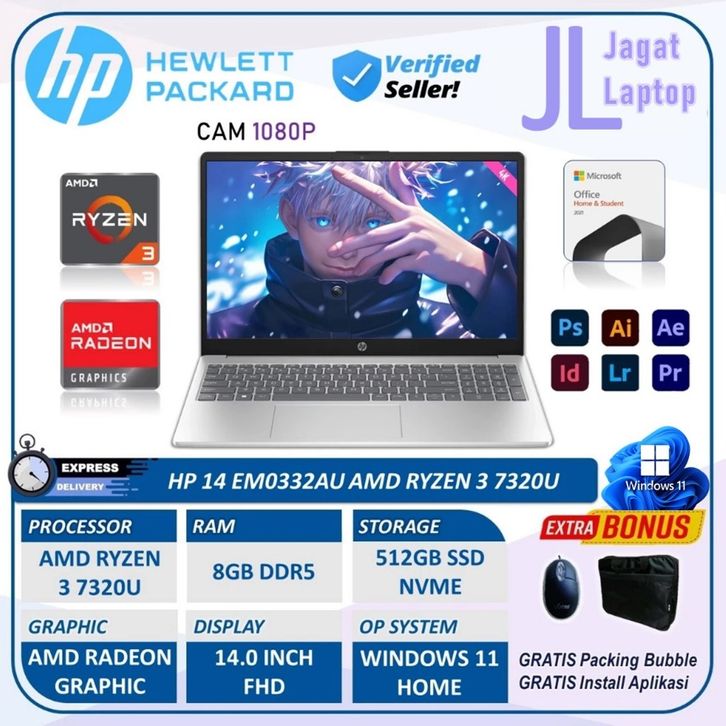 Hp 14 EM0332AU Amd Ryzen 3 7320U 8GB DDR5 512GB SSD 14.0" FHD