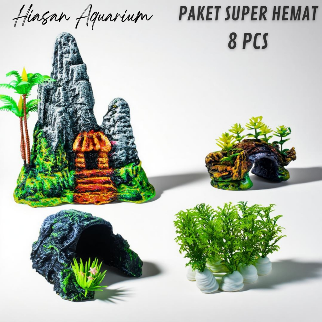 Paket Super Hemat 8 PCS Hiasan Aquarium Ornamen Rumah Gunung