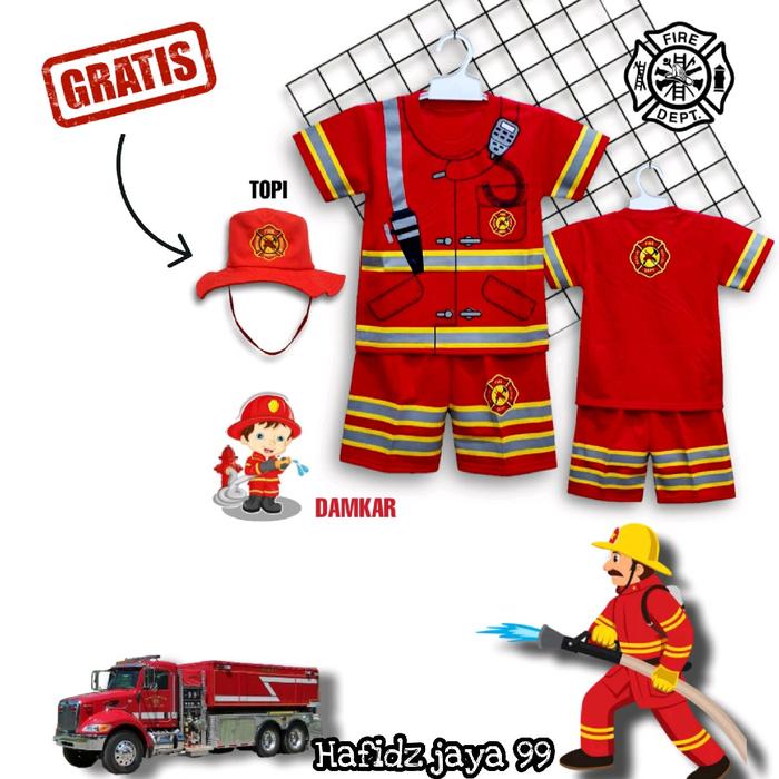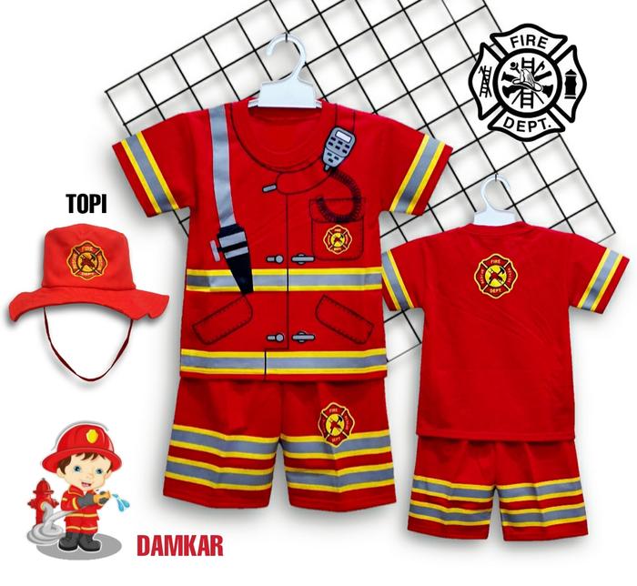 SETELAN ANAK BAJU PROFESI PEMADAM KEBAKARAN/SET BAJU DAMKAR SET TOPI Lengan pendek Katun Bisa Dicuci Dengan Mesin