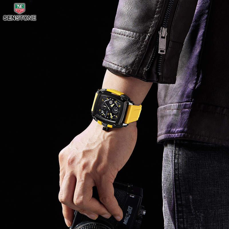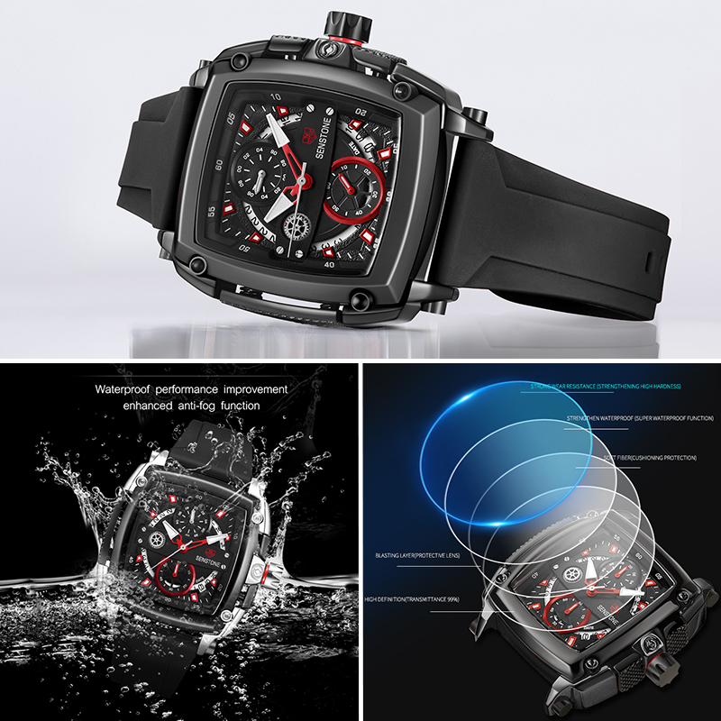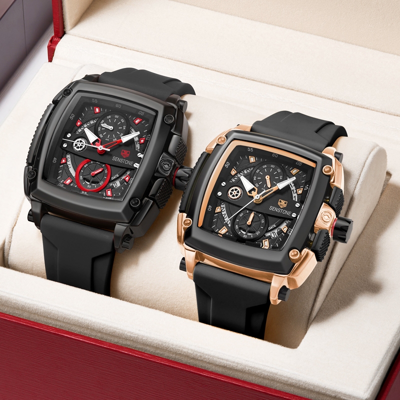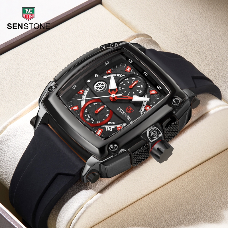 SENSTONE Jam Tangan PriaTerbaru Asli Anti Air Kalender Bercahaya Mewah Hitam Mewah Baja tahan karat Jam Pria Kotak Hadia