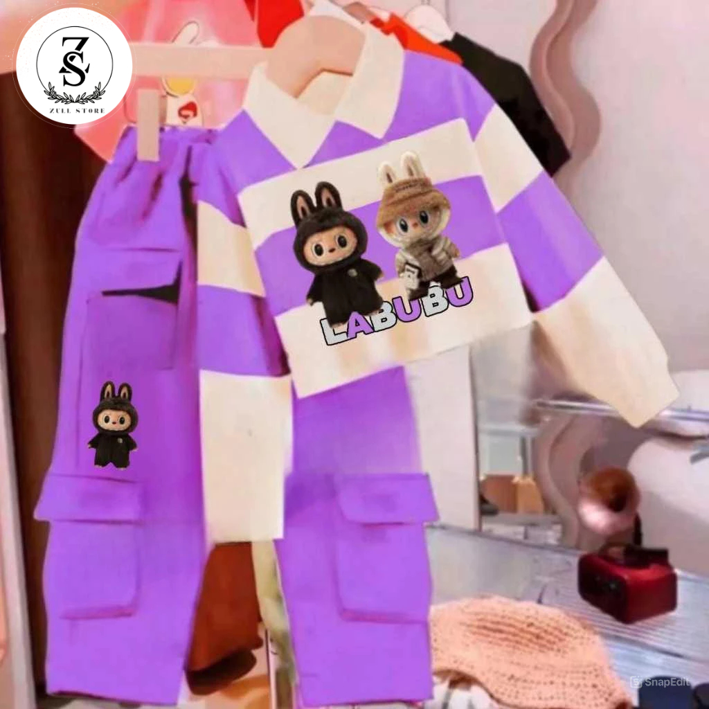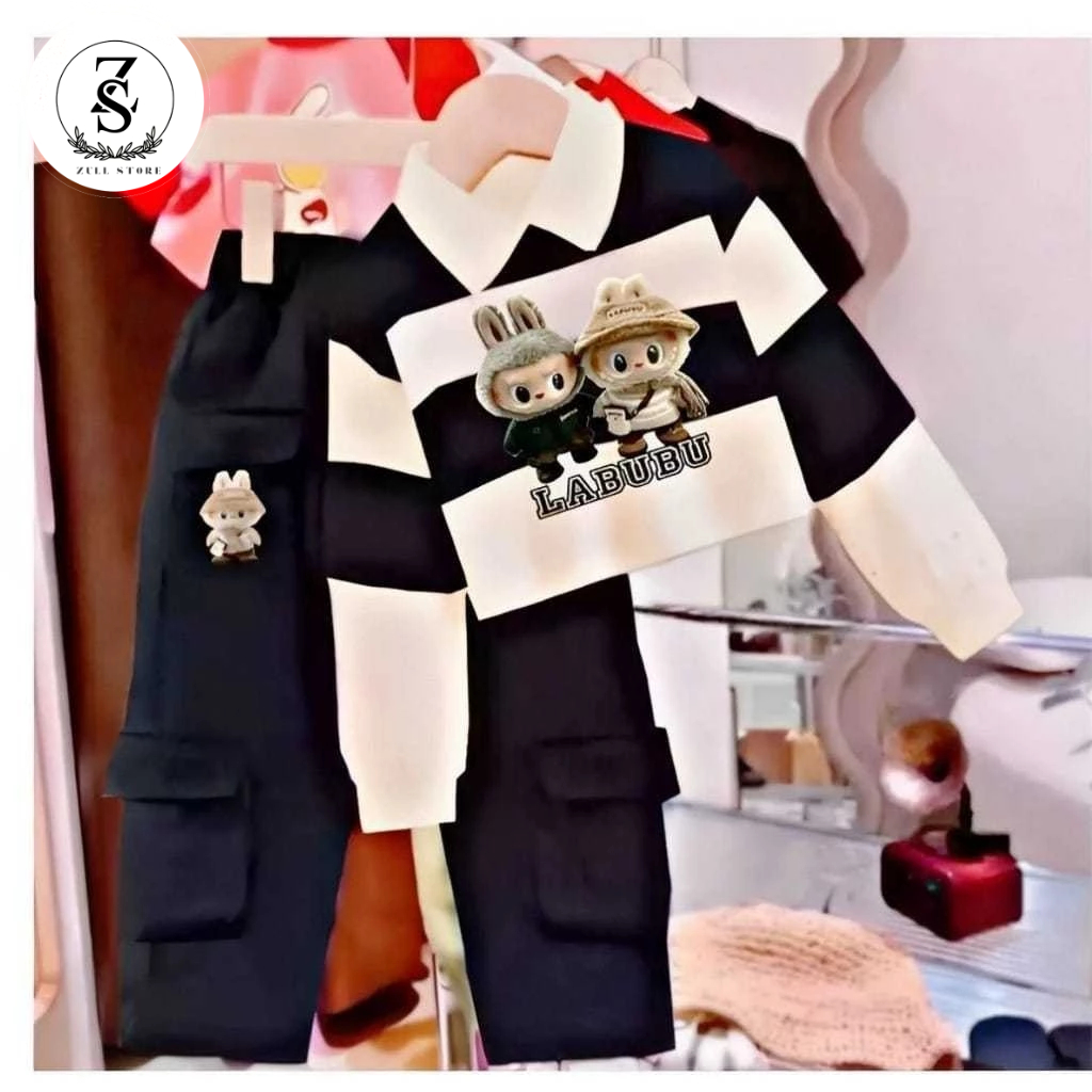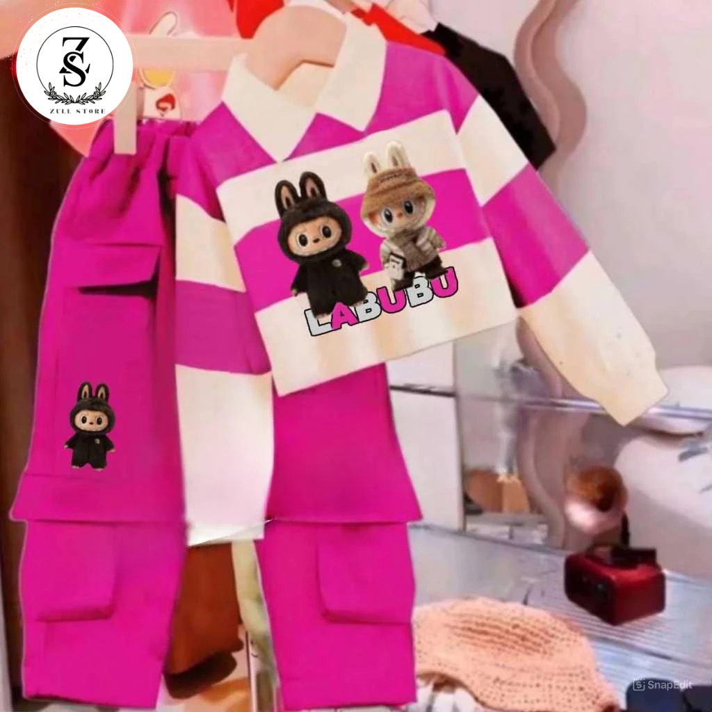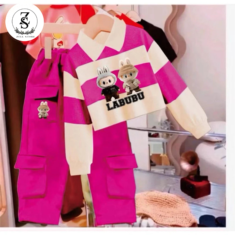 Setelan Anak Cewek Motif Labubu Lucu | Baju Anak Perempuan & Celana Cargo 1–10 Tahun