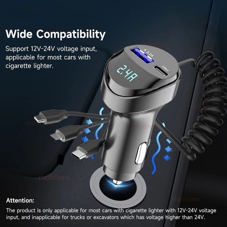 Promo 3.1A LED Dital Display Car Charger With 3 in 1 Cable Dual port USB +type-c port Phone Charger