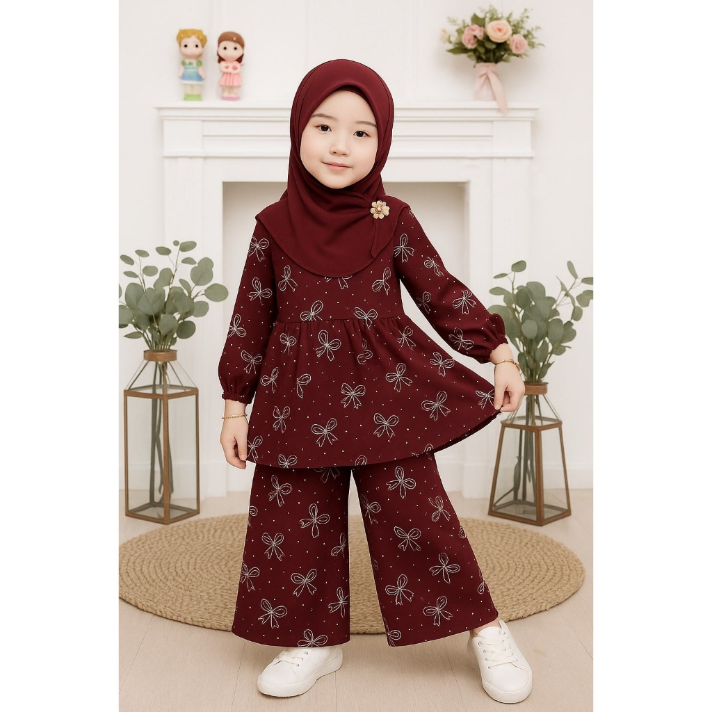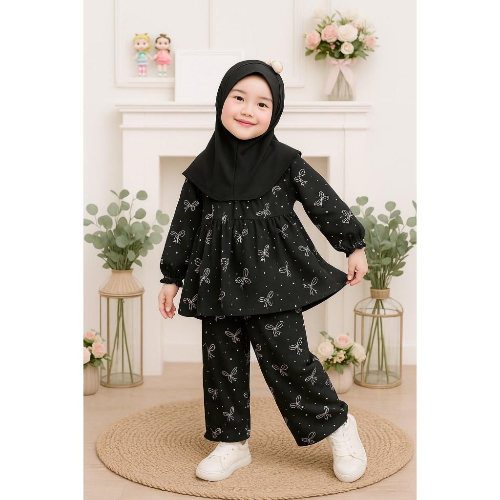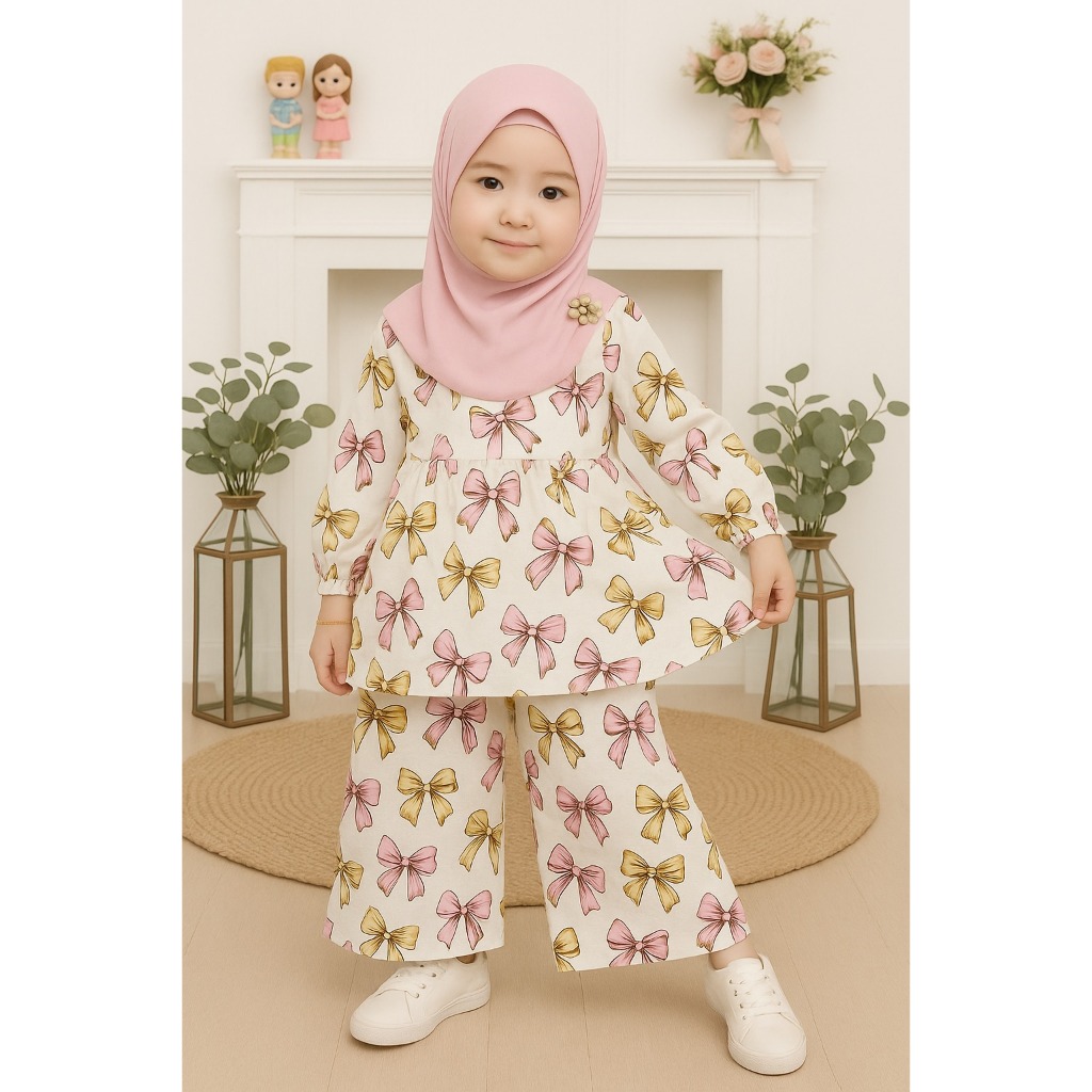 Setelan Anak Motif Pita dan Celana Panjang Baju Anak Perempuan 3-12 Tahun Bahan Rayon