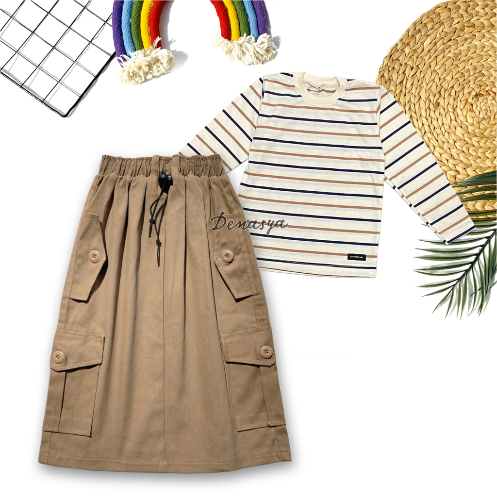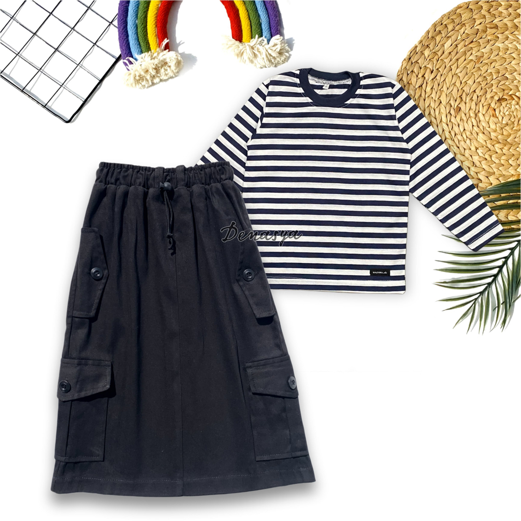 SETELAN ROK CARGO KATUN ANAK PEREMPUAN / ONE SET KAOS STRIPE BELANG ANAK USIA 1-12 TAHUN KEKINIAN