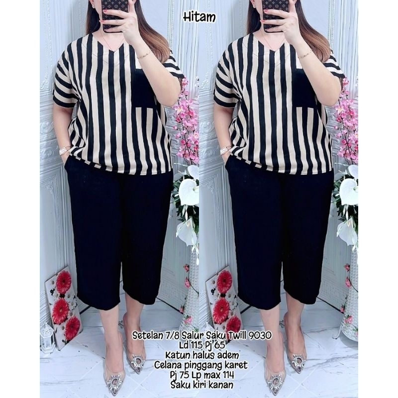 Setelan andin semi Rayon salur kombinasi polos / Setelan baju celana katun rayon Salur Kombinasi Kekinian / Oneset