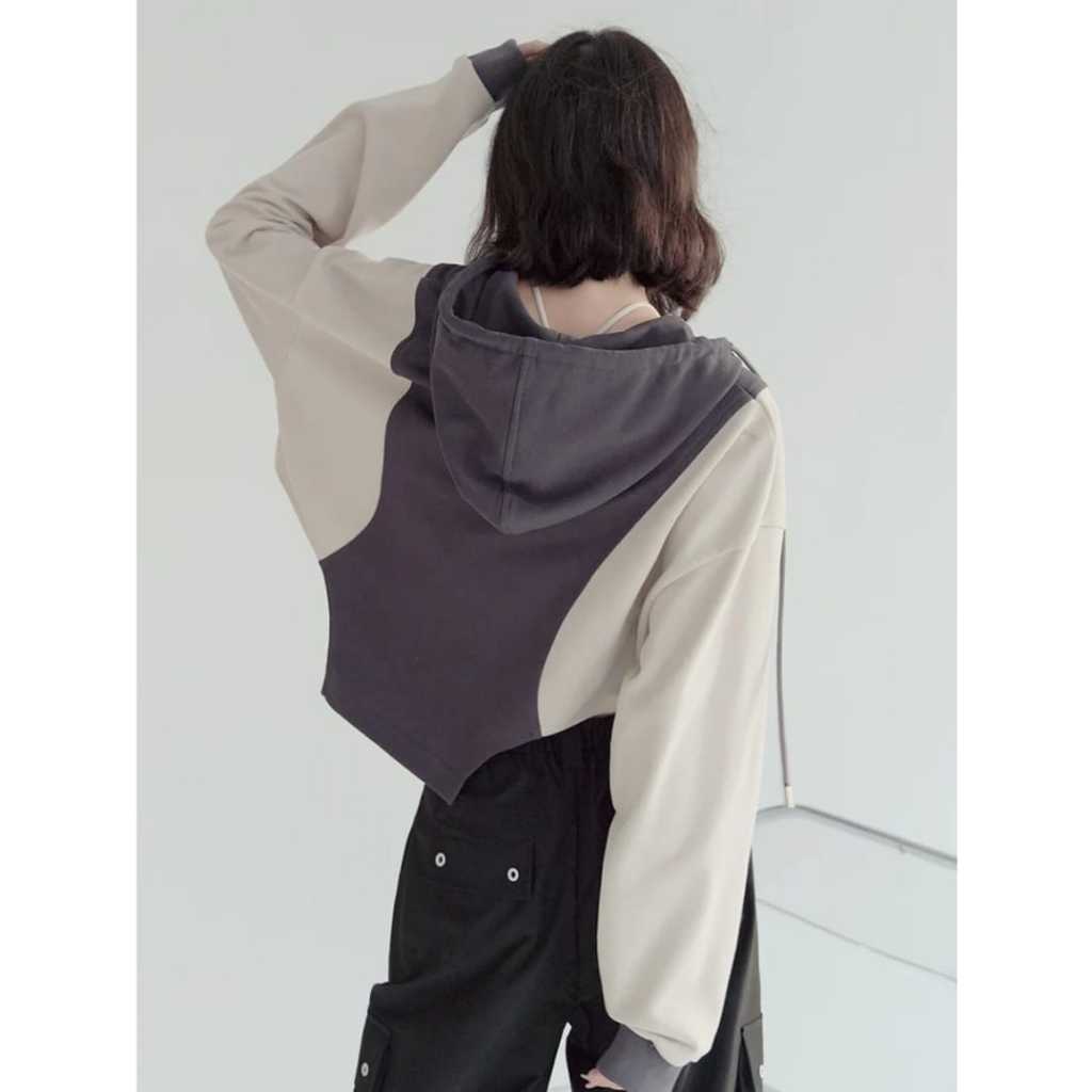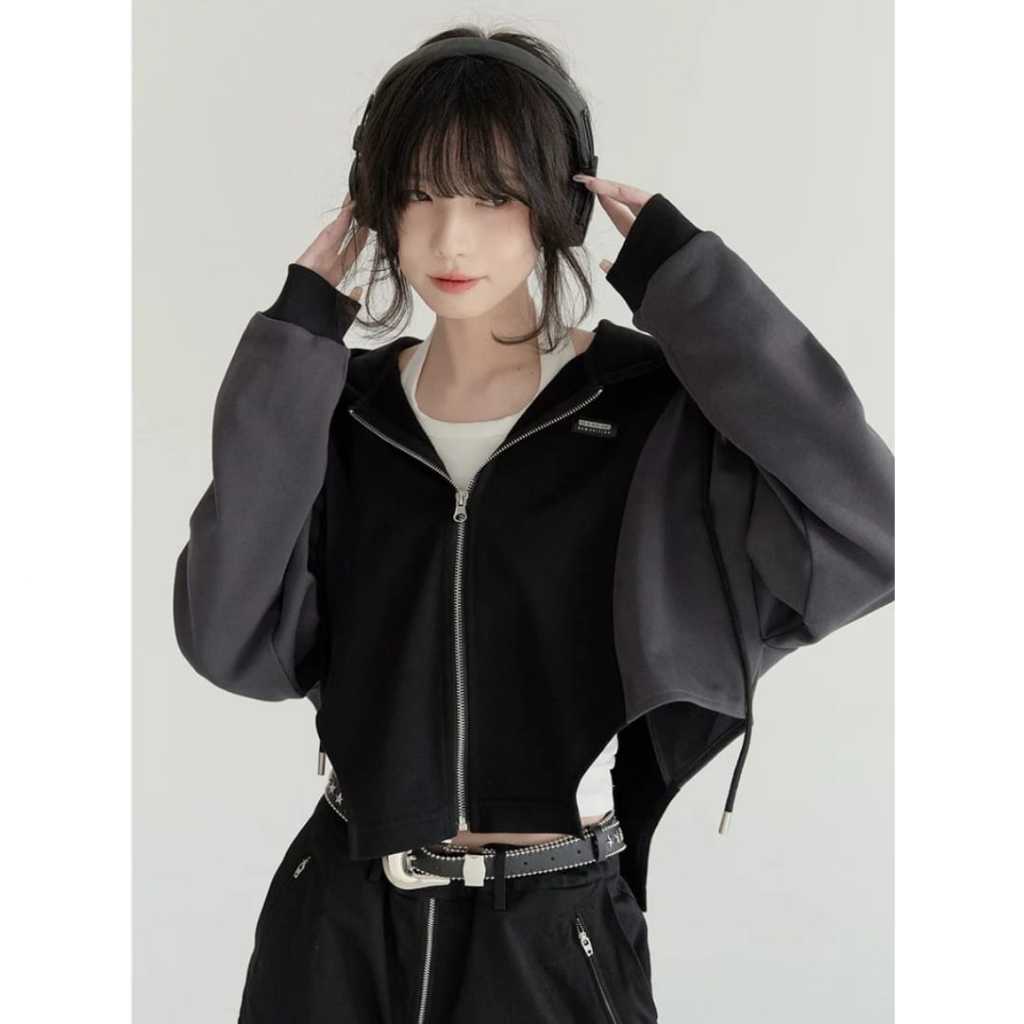 JAKET WANITA KOREAN STYLE PATCHWORK COMBIE COLLOR HOODED | JAKET CROP ZIPPER HOODIE WANITA