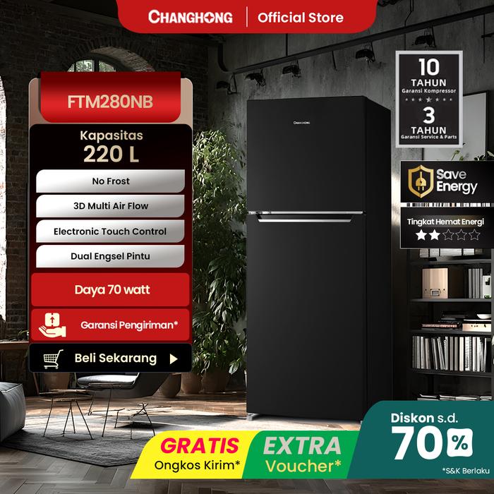 FLASH SALE CHANGHONG KULKAS 2 PINTU NO FROST REFRIGERATOR KAPASITAS 220 LITER FTM280NB BLACK (LEMARI ES TIDAK ADA BUNGA ES HEMAT LISTRIK WARNA HITAM COCOK UNTUK PENDINGIN MINUMAN) LISTRIK HITAM