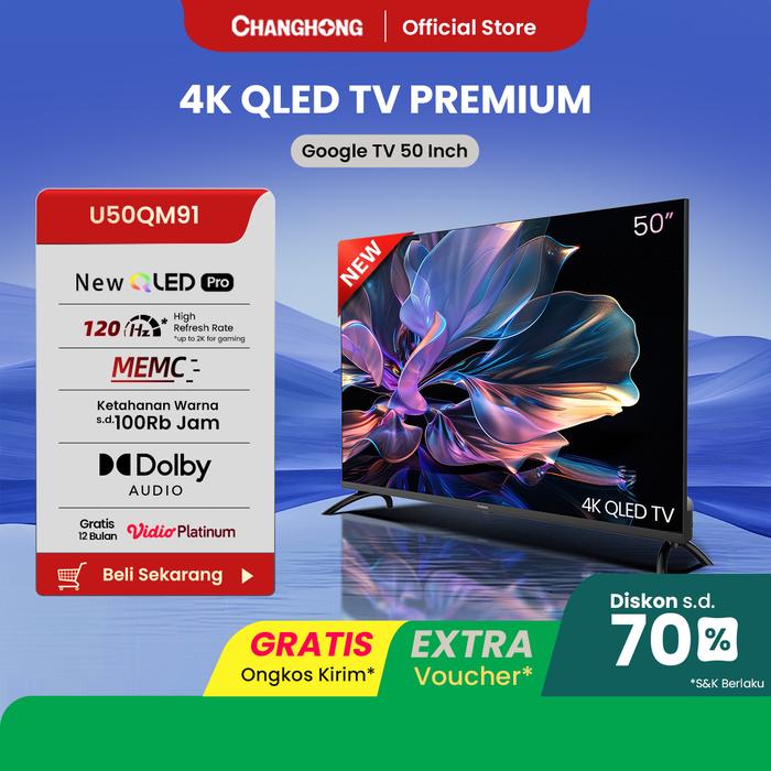 FLASH SALE CHANGHONG QLED TV 4K 50 INCH GOOGLE SMART QLED PRO DIGITAL TV DOLBY AUDIO DBXTV GOOGLE PLAY NETFLIX YOUTUBE BLUETOOTH USB GOOGLE ASSISTANT (U50QM91)