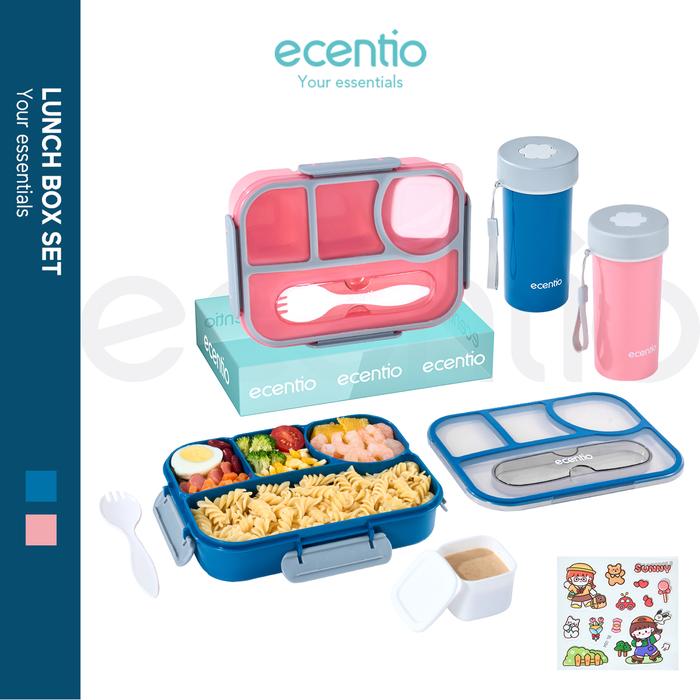 PROMO 8.8 ECENTIO KOTAK MAKAN 1100ML SET SEKAT 4 STICKER LUNCH BOX BPA FREE BIRU