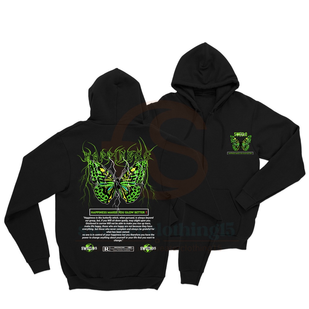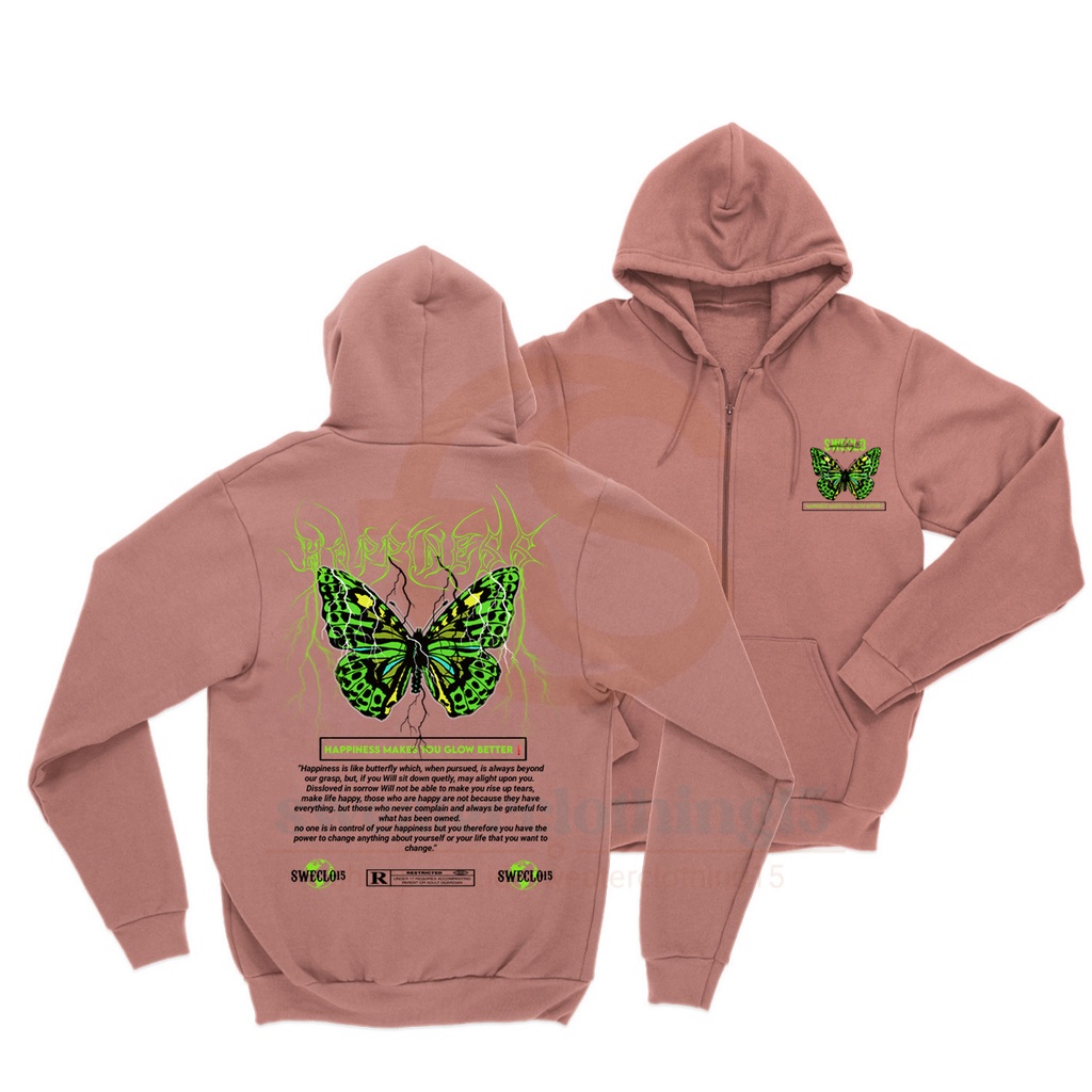 HOODIE ZIPPER JAKET TERBARU OVERSIZE HAPPINES BUTTERFLY (SABLON DEPAN BELAKANG) SIZE M-XXL UNISEX PRIA DAN WANITA