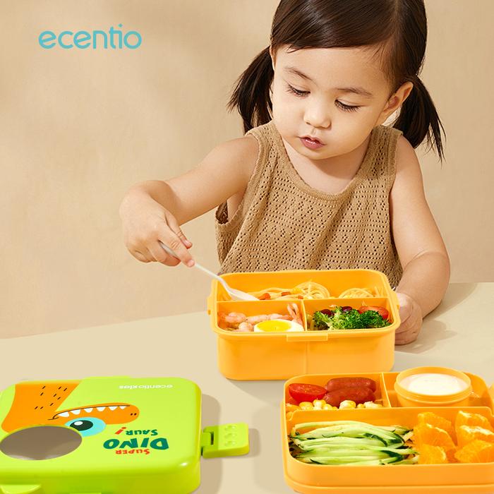 PROMO 8.8 【PP 5】ECENTIO KOTAK MAKAN ANAK 3 SEKAT 1100ML 2 LAYER KARTUN DINOSAURUS DENGAN SENDOK GRATIS BPA FREE BIRU