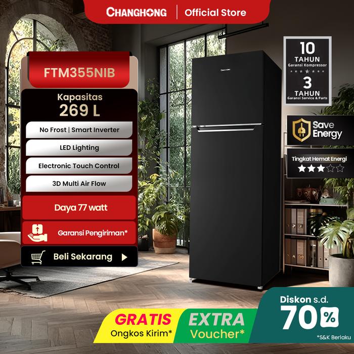 FLASH SALE CHANGHONG KULKAS 2 PINTU INVERTER NO FROST REFRIGERATOR KAPASITAS 269 LITER FTM355NIB BLACK GAP 45 HITAM
