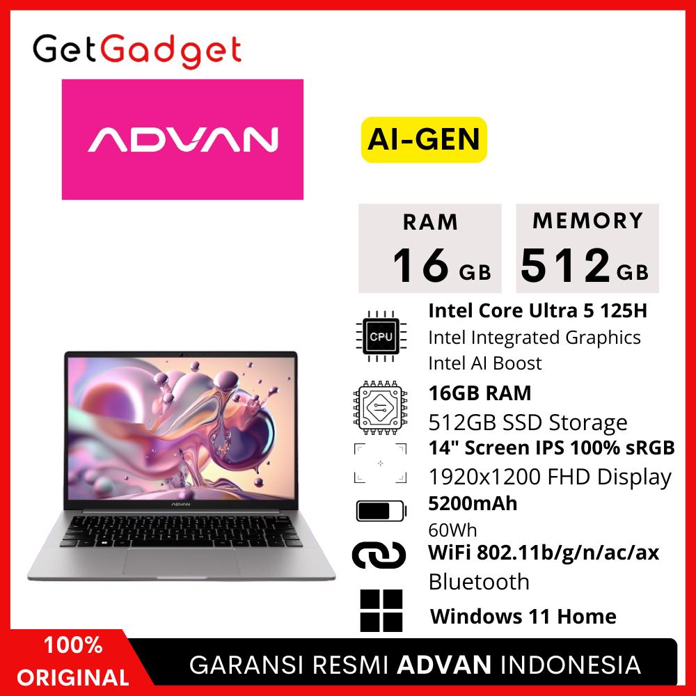 Advan Laptop AI Gen RAM 16GB 512GB Notebook Intel Core Ultra 5 125H IPS Windows 11 New Original Garansi Resmi