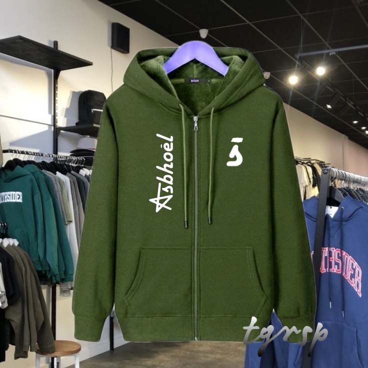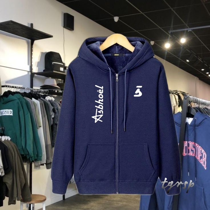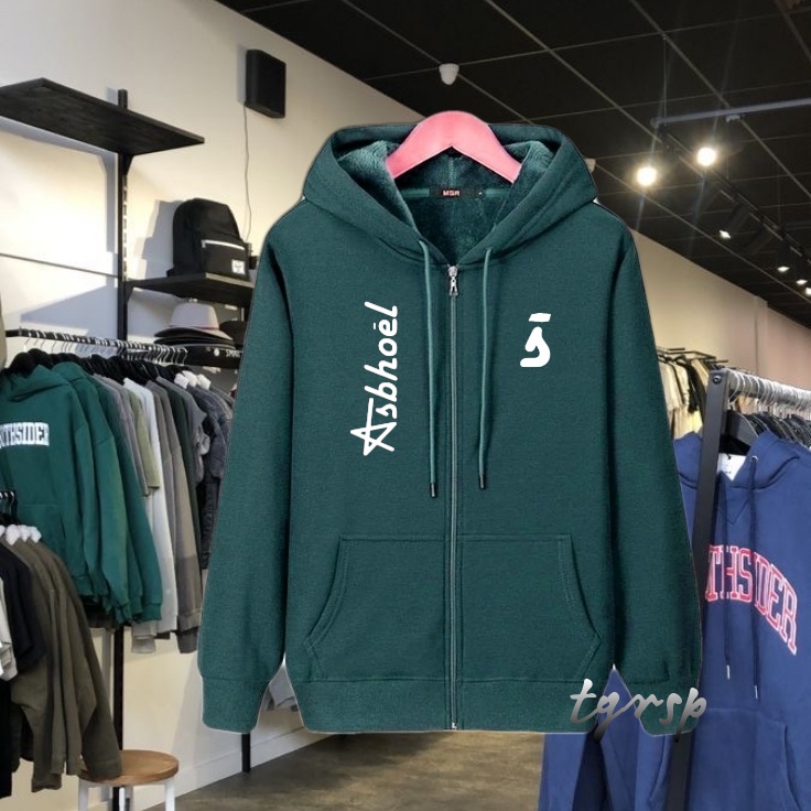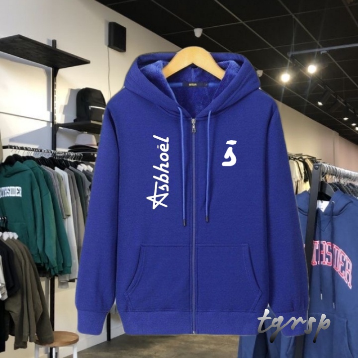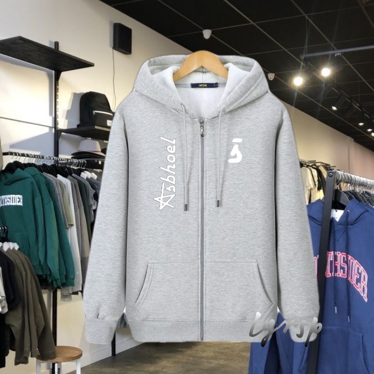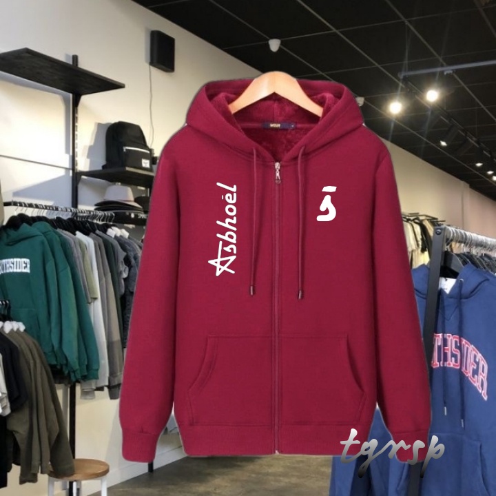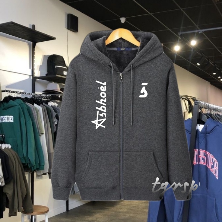 JAKET HOODI ZIPER ASBHOEL TEXT PUTIH//SWEATER HOODI ZIPER PRIA DAN WANITA