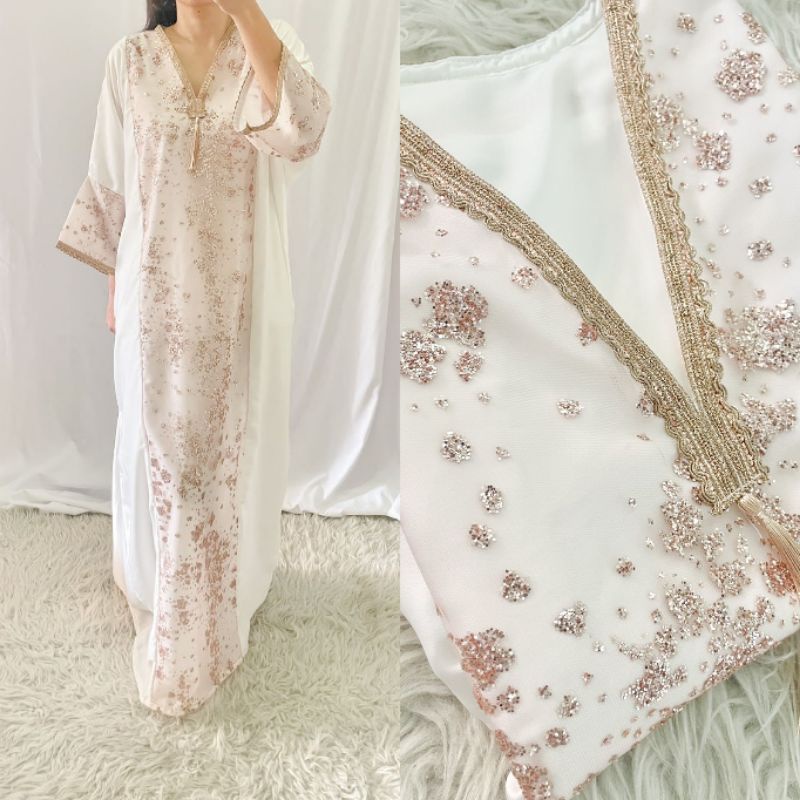 Kaftan Arabian Putih Satin Mix Motif Minimalis