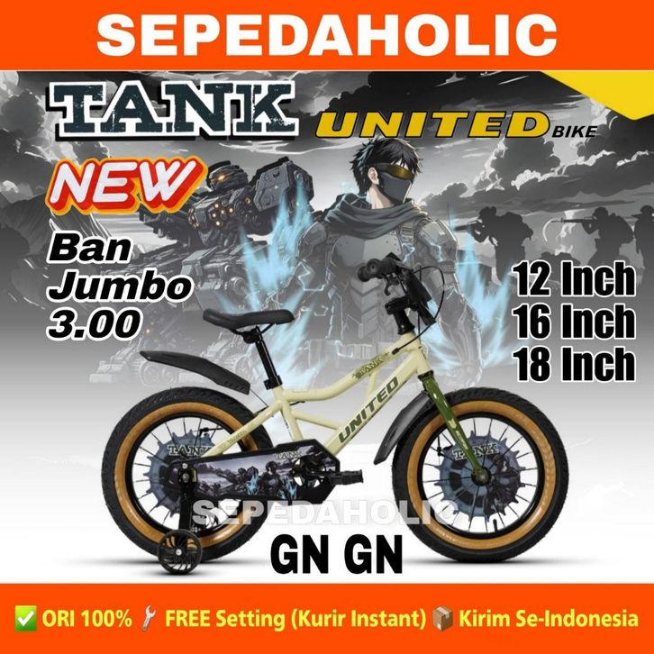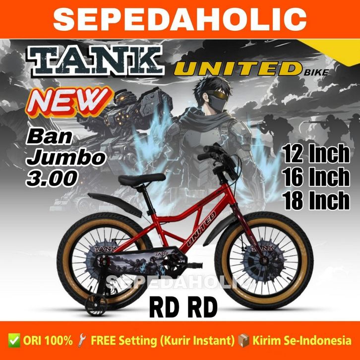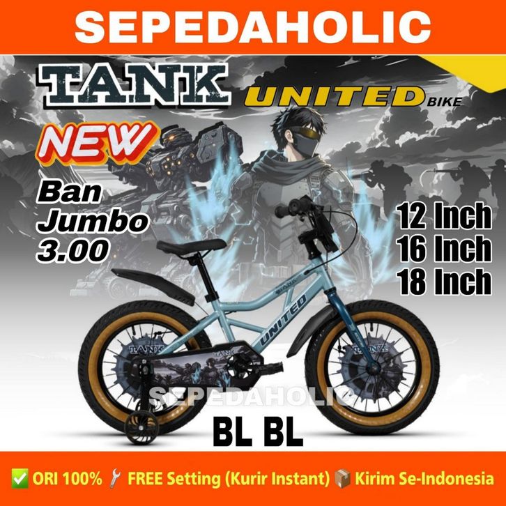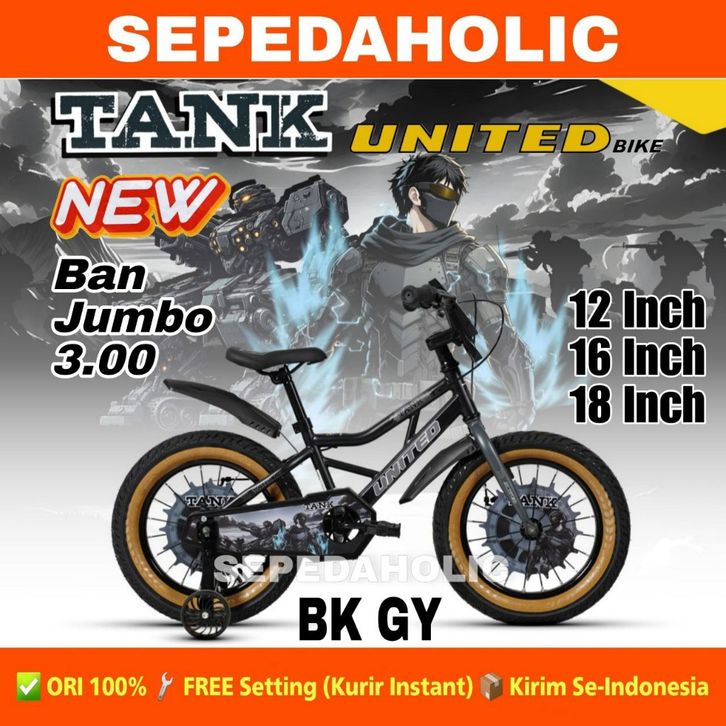 Sepeda Anak Laki BMX UNITED TANK NEW Ukuran 12 16 18 Inch Ban Jumbo 3.00 Usia 2-8 Tahun Premium