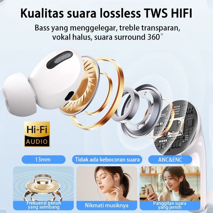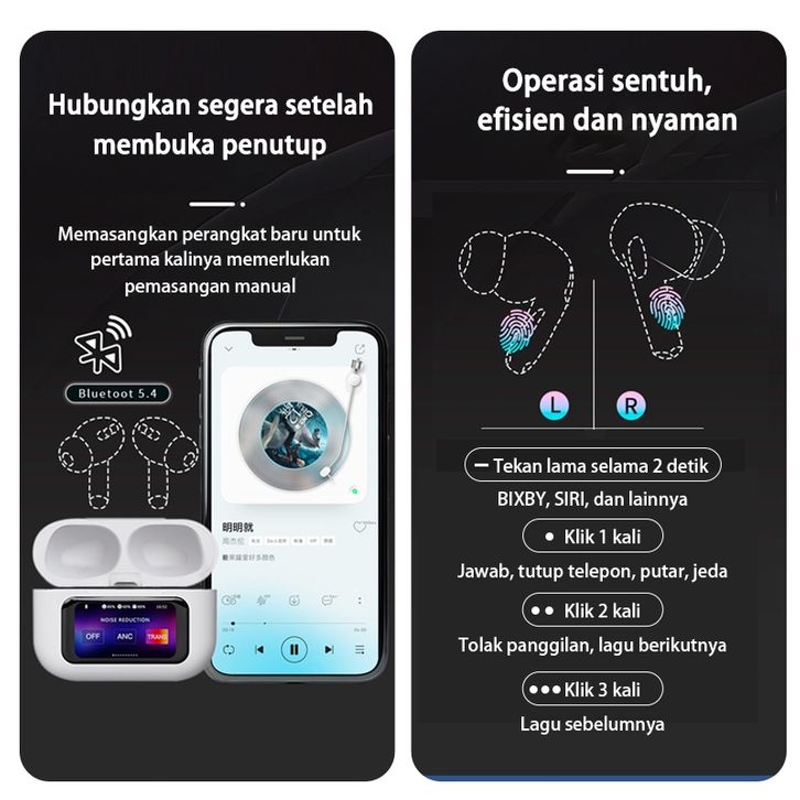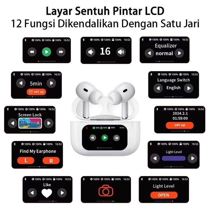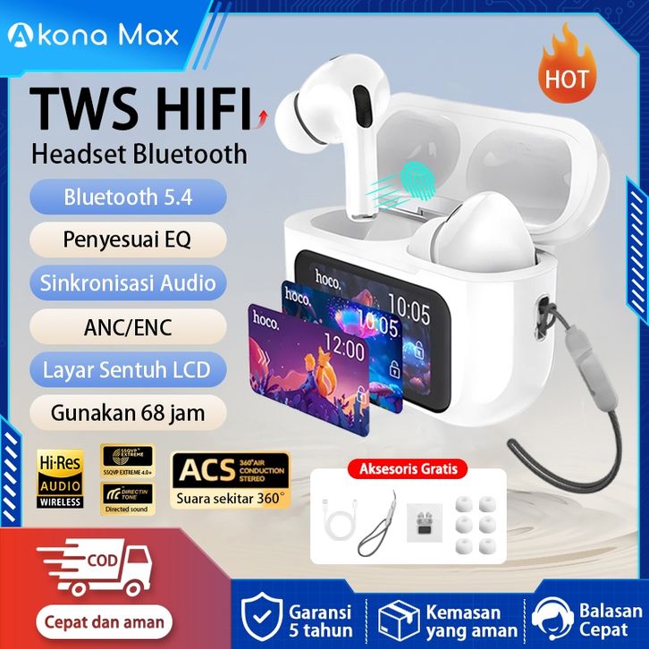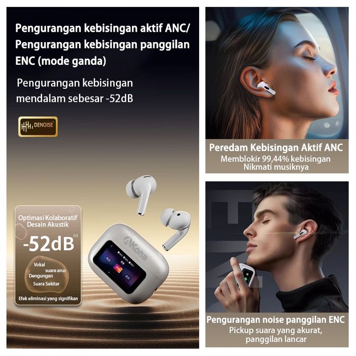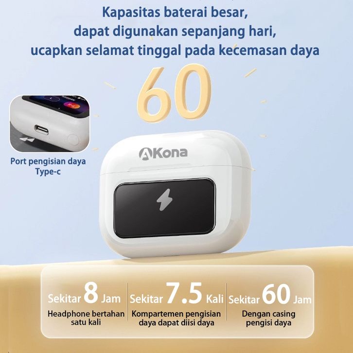 Akona TWS Headset Earphone Bluetooth Wireless Super Full Bass Type-c ANC/ENC Suara Sekitar 360° Layar Sentuh LCD Active