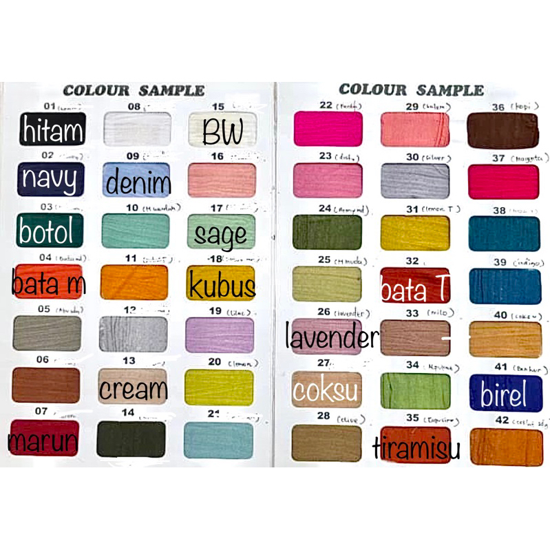 1. Hitam, 37. Coksu, Biru elektrik, Broken white, Cream, Bata Tua, kubus, Denim