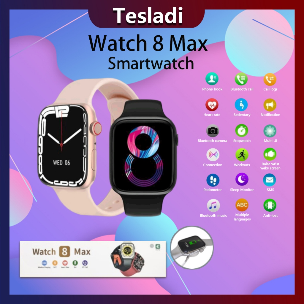 Tesladi Smartwatch Watch8 Max 1.85 Inches Full Square Screen NFC Bluetooth Call Jam Tangan Pintar IP67 Waterproof Heart Rate Monitor Fitness Smart Watch