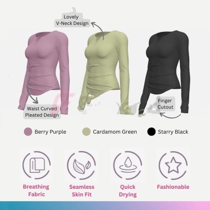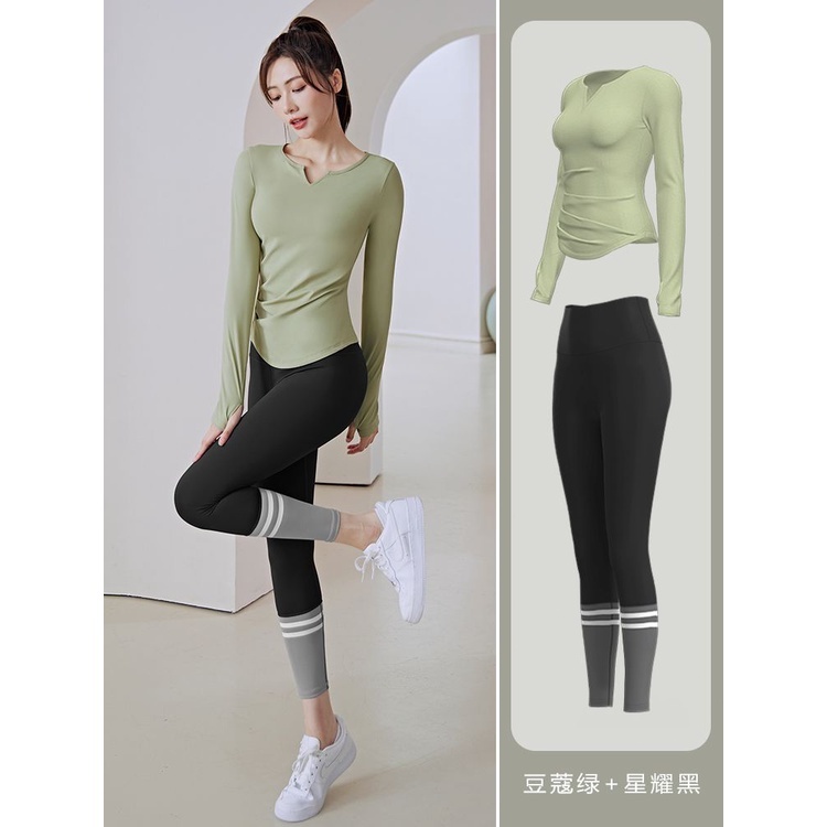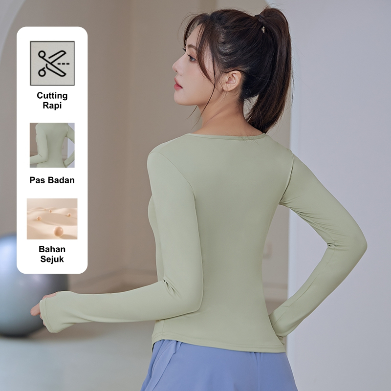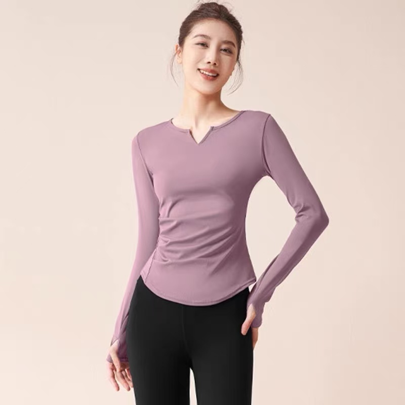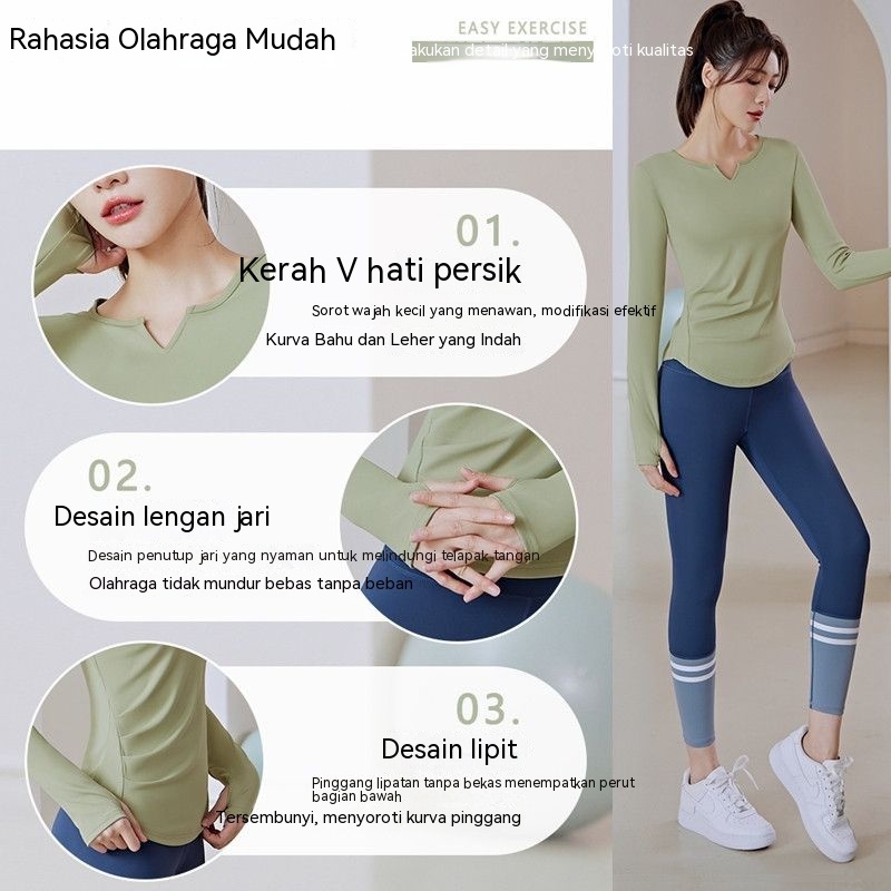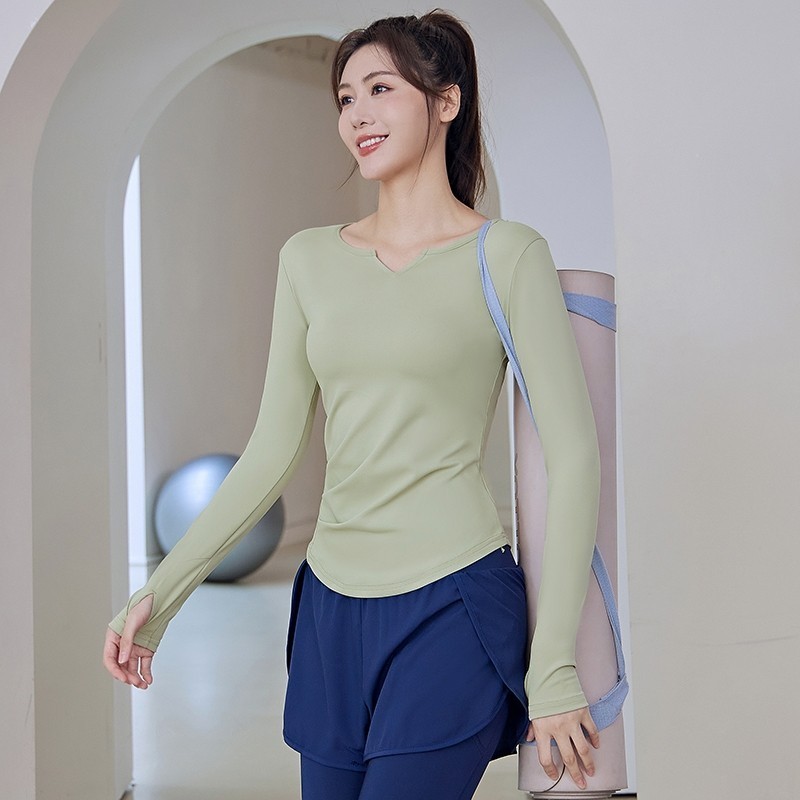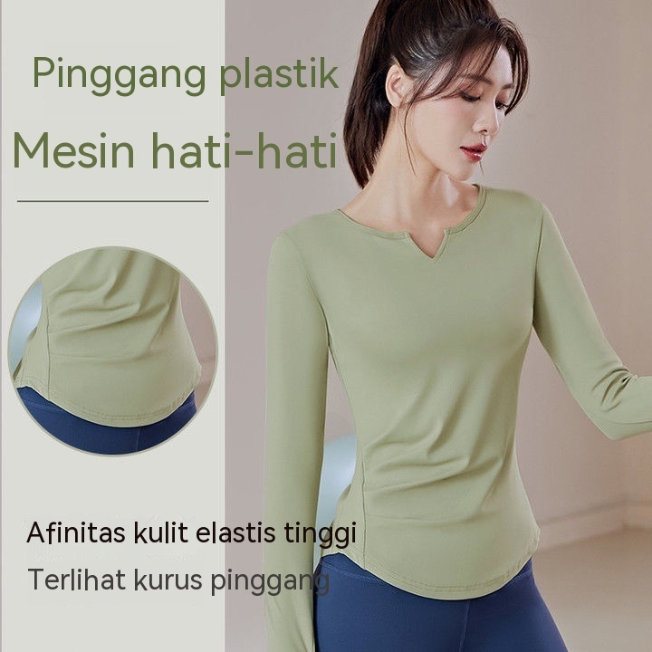 Warna solid V-neck lengan panjang T-shirt bernapas cepat kering pakaian yoga atasan olahraga pinggang ramping ketat