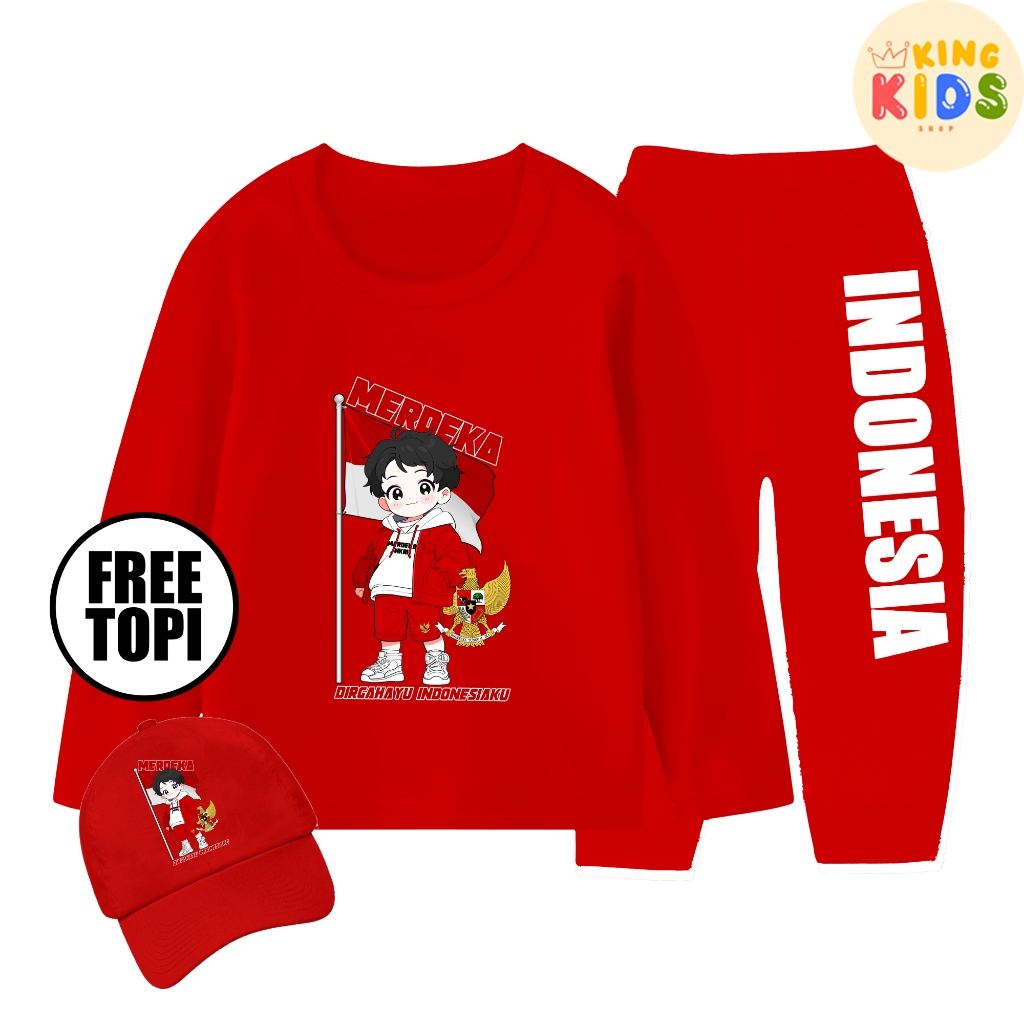 PAKET BAJU + TOPI KEMERDEKAAN RI 17 AGUSTUS 1945 Setelan Lengan Panjang Anak Laki-laki Usia 1-10 Tahun