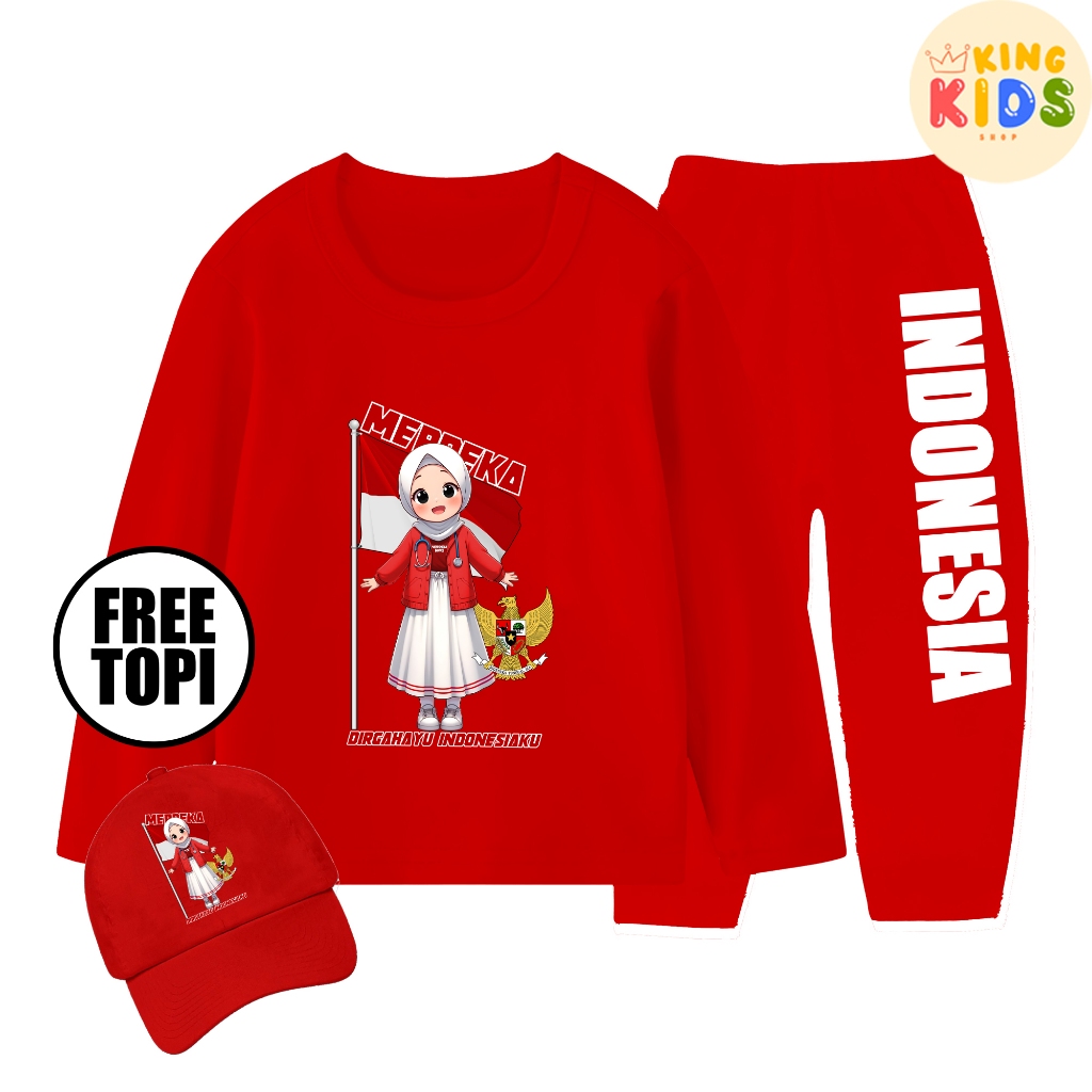 PAKET BAJU + TOPI KEMERDEKAAN RI 17 AGUSTUS 1945 Setelan Lengan Panjang Anak Perempuan Usia 1-10 Tahun