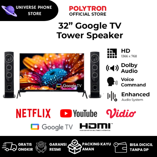 POLYTRON GOOGLE TV 32 43 50 INCH SMART TV CINEMAX WITH TOWER SPEAKER YOUTUBE NETFLIX GARANSI 5 THN FREE ONGKIR