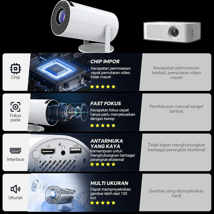 TERLARIS MISENI HY300 SMART PROYEKTOR HP KE DINDING 4K HD LCD ANDROID11 FOR HOME THEATER OFFICE- BLUETOOTH & WIFI - BUI