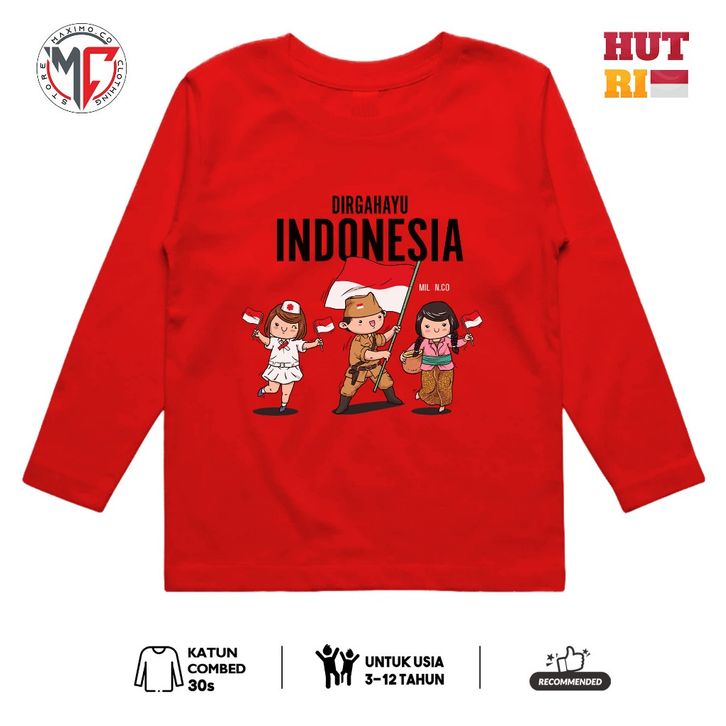 MAXIMO.CO Kaos anak kemerdekaan 17 Agustus lengan panjang merah usia 4-12 tahun bahan katun premium