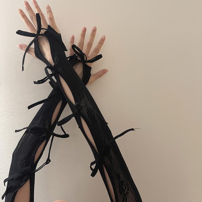 【Goth】Vintage Hollow Lace Sleeves Fingerless Cover Bowknot 8839