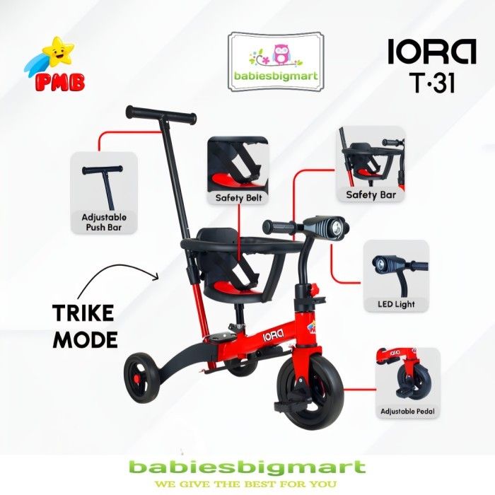 TERLARIS SEPEDA ANAK RODA TIGA PMB IORA T 31 BALANCE BIKE 6 IN 1 DORONG STIR