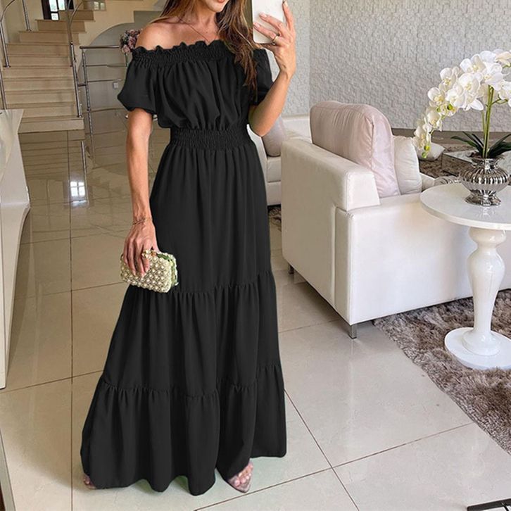 Maxi Dress Sabrina Off Shoulder Ruffle Rampel Susun Smock Bahan Crinkle