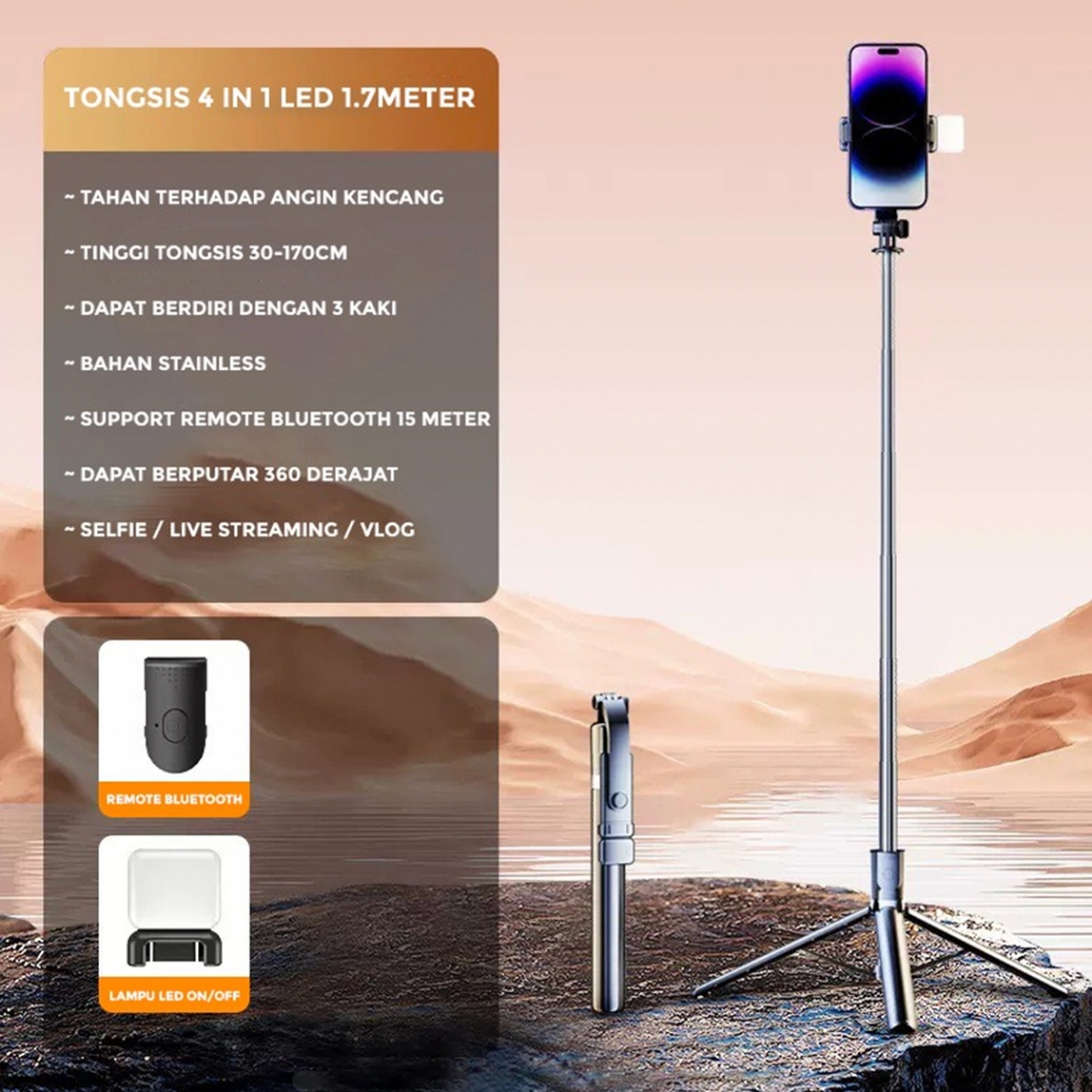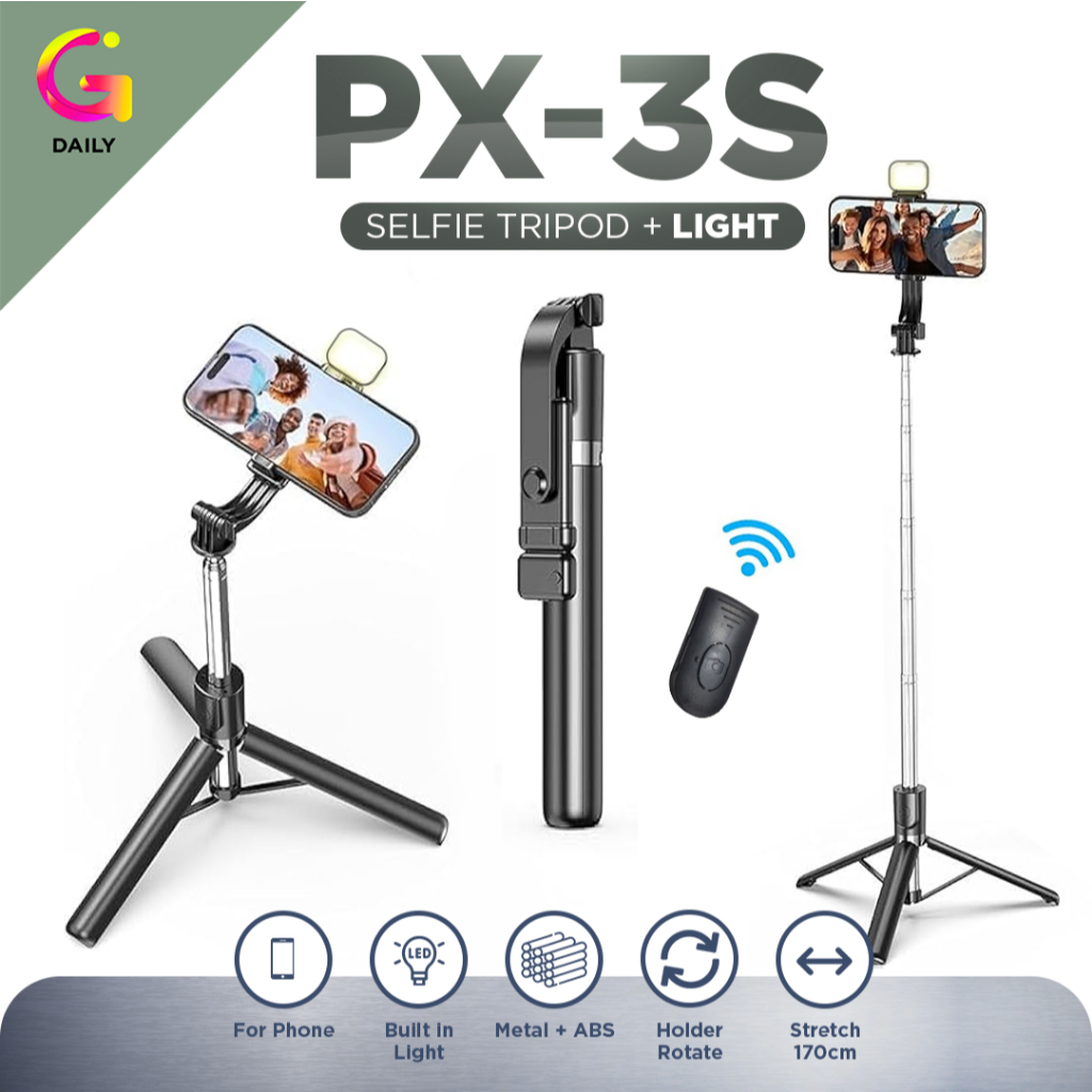 Tripod PX-3s tinggi 170cm Wireless R1L Selfie Stick HP lengkap dengan Remot Bluetooth dan Lampu LED