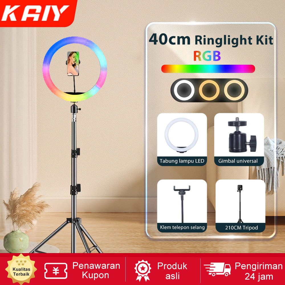 KAIY 43cm RGB RingLight+160CM/210CM Tripod+Phone Holder 3 suhu warna Lampu Fotografi Lampu LED Video Light for Live Stream Makeup YouTube