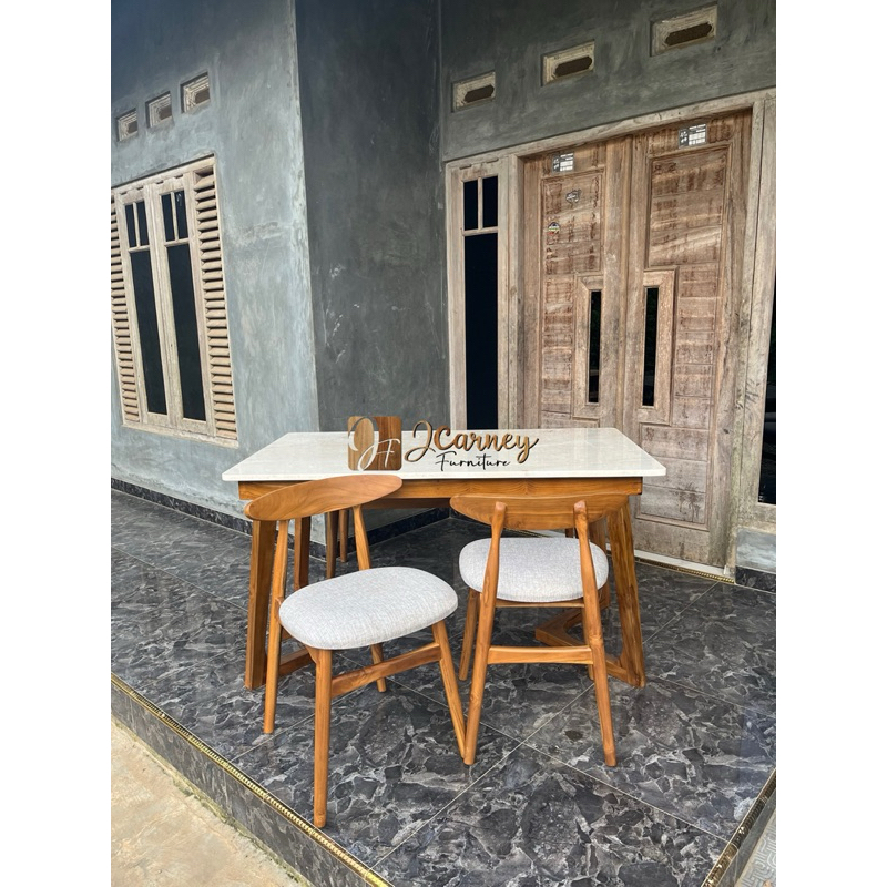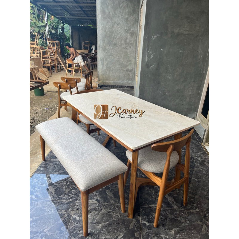 SET MEJA KURSI MAKAN JATI 2 KURSI + 1 BENCH T0P TABLE MARMER