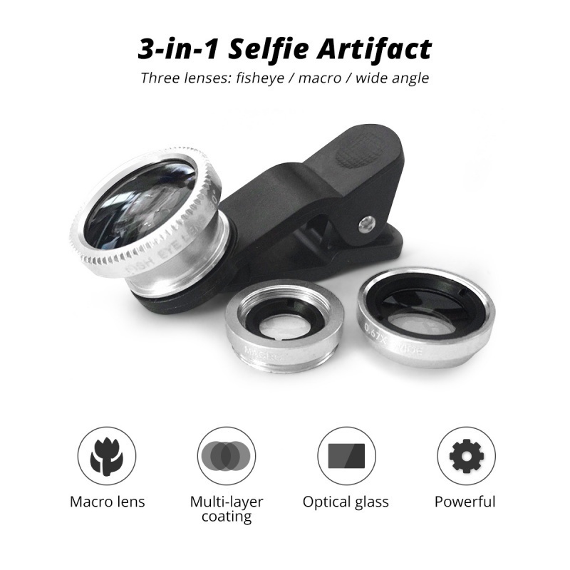 3in1 Lensa Kamera HP Fisheye / Wide Angle / Macro / Zoom Dengan Klip on Untuk Smartphone
