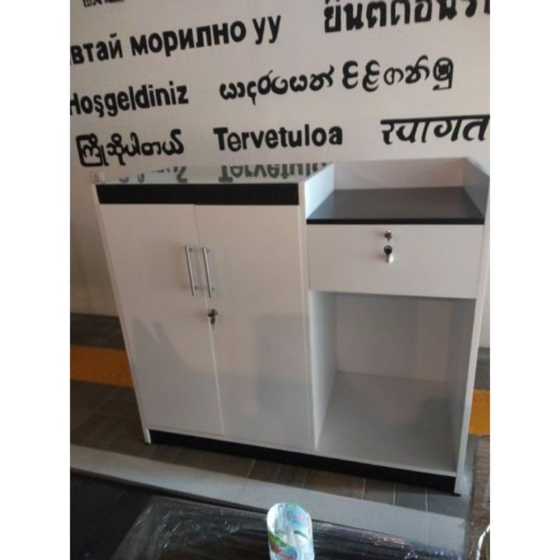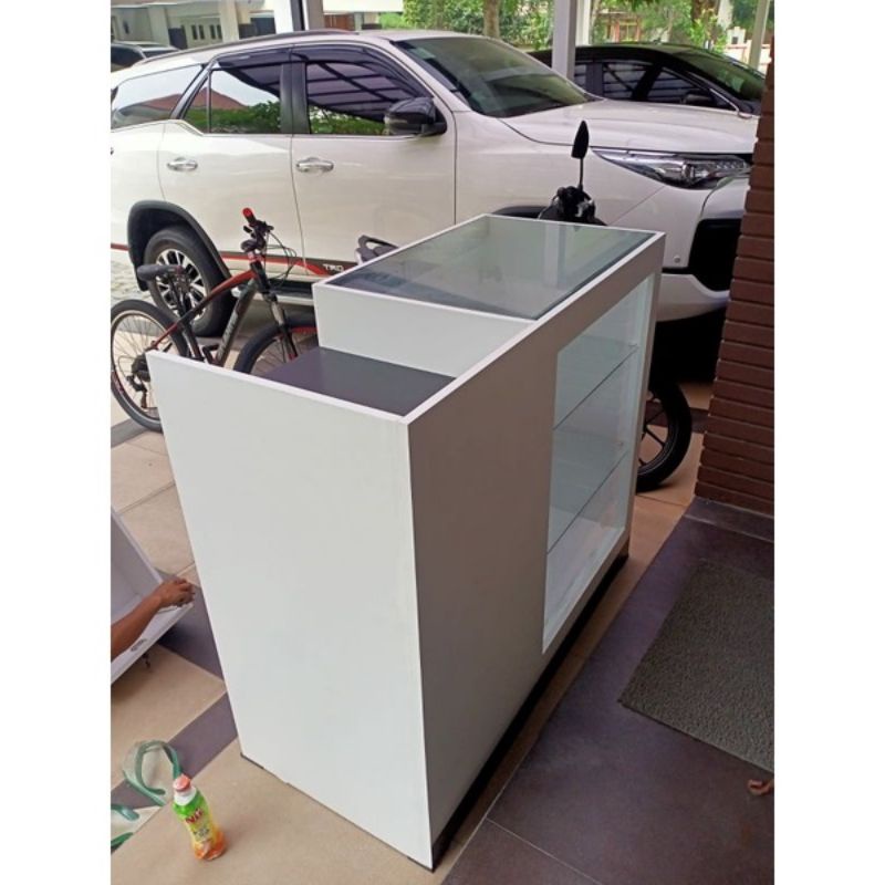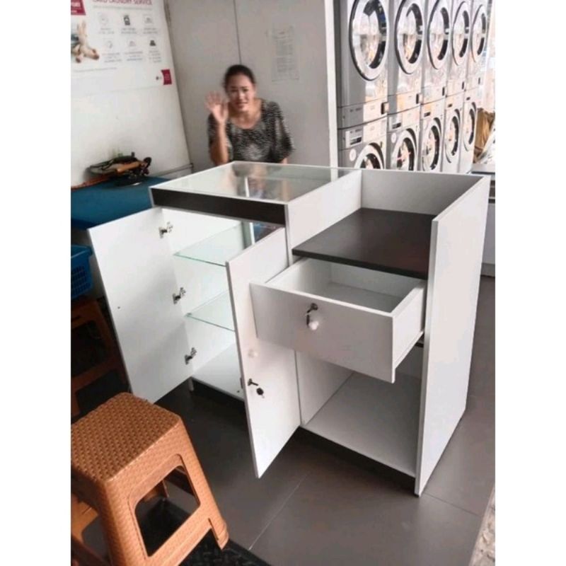 MEJA KASIR MINIMALIS SIZE 11550100 DEPAN KACA / MEJA KASIR LAUNDRY / MEJA RESEPSIONIS MURAH / MEJA KASIR / MEJA KASIR