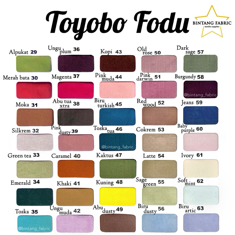 Hitam, Navy, Putih Bw, Putih Bersih, Silver, Abu Muda, Abu Tua, Biru Elektrik, Biru Langit, Denim, Biru Ice, Biru Wardah, Mint, Hijau Botol, TNI, Olive, Cokelat, Milo, Kunyit Gold, Kubus, Lemon, Lavender, Marun, Merah, Pink DW, Coksu/Nude, Salem, Orange, Alpukat, Merah Bata, Moka, Silver Cream, Green Tea, Emerald, Toska, Ungu Plum, Magenta, Abu Tua Xtra, Pink Dusty, Caramel, Khaki, Ungu Muda, Kopi, Pink Muda, Biru Turkish, Kaktus, Kuning, Abu Dusty, Old rose, Pink darwin, Red wood, Cokrem, Latte, Sage green, Biru dusty, Dark sage, Burgundy, Jeans, Baby purple, Ivory, Soft mint, Biru artic, Warna Lain Dikatalog