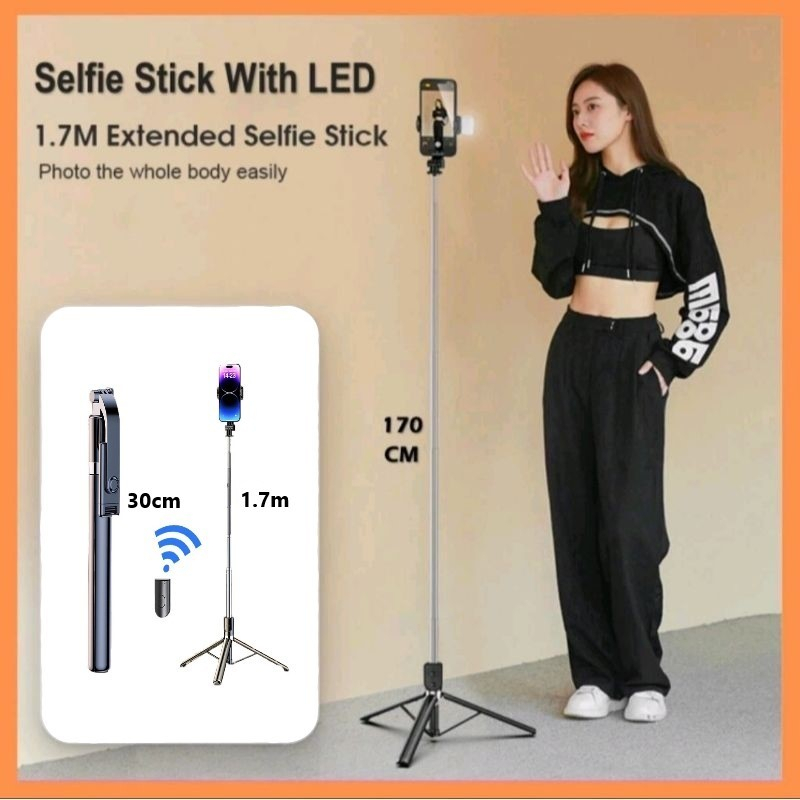 Tongsis Tripod 1.7m Bluetooth Remote 4in1 Selfie Stick 170cm Led Light
