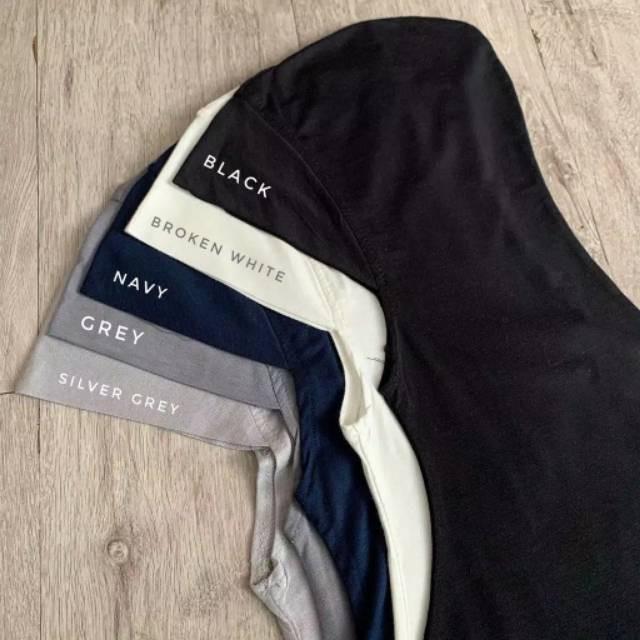Abu Muda, Abu Tua, Beigi, Biru Soft, Burgundi, Cokelat Pramuka, Cokelat Tanah, Coksu, Cream, Denim, Dusty Lavender, Dusty Pink, Hijau Sage, Hitam, Khaki, Kulit, Kuning Mustard, Maroon, Merah Cabe, Moca, Mocacino, NUdish, Navy, Nude, Plum, Putih, Putih Tulang