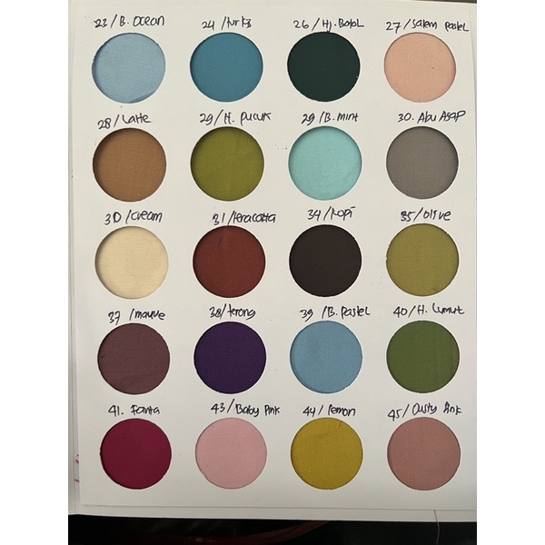 BW, Coksu Delux, CoklatSusu, Lavender, (18) Dusty tua, Lillac, Turkis, SalemPastel, (27)hijau Tosca, Latte/Thai tea, HijauPucuk, Olive, Mauve, (38) terong, (39)DustyBlue, BabyPink, Lemon, DustyPink, (47) Dove, Dw, Purple, Peach(21)Rose Gold, Taro, Dustymuda, Army, ThaiTea(28), HijauWardah(07), Hitam, Navy, Putih, (09)silver Tua, (25) Tosca Tua, (29) Coffe, Mustrad, 10 abu-abu, (11)abu tua, (16) mocca, (15/17) Milo, Silver muda, (46) denim Muda, Biru Elektrik, (24)(23) beige, (71)Hijau semen, (28)beige, (22) Biru Mint, (61) avocado, Merah, Kubus, Fuchia Fanta, Maroon, Hijau wardah Dx, Dustypink DX, Magenta, Denim, Botol Md, Maroon Tua, Pemda, Botol, Tosca dx (33yard)