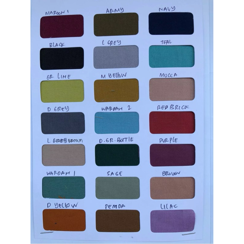 Lavender, Abu Tua, Dusty pink, Denim Muda, Burgundy, Ungu, Putih, Hitam, Lime, Sage, Teal, Violet, Mustard, Abu muda / silver, Abu sedang, Maroon, Hijau army, Navy, Coksu / mocca, Wardah 2, Bata / terracotta, Cream, Hijau botol, Coffe, Milo, Biru Muda, Bw, Pink salem, Biru BCA / blue web, Hijau wardah/wardah1, Denim Tua, Sage Tua ( new ), Blue Sky, Tembaga, Merah, Lilac, Pemda, Abu SMA