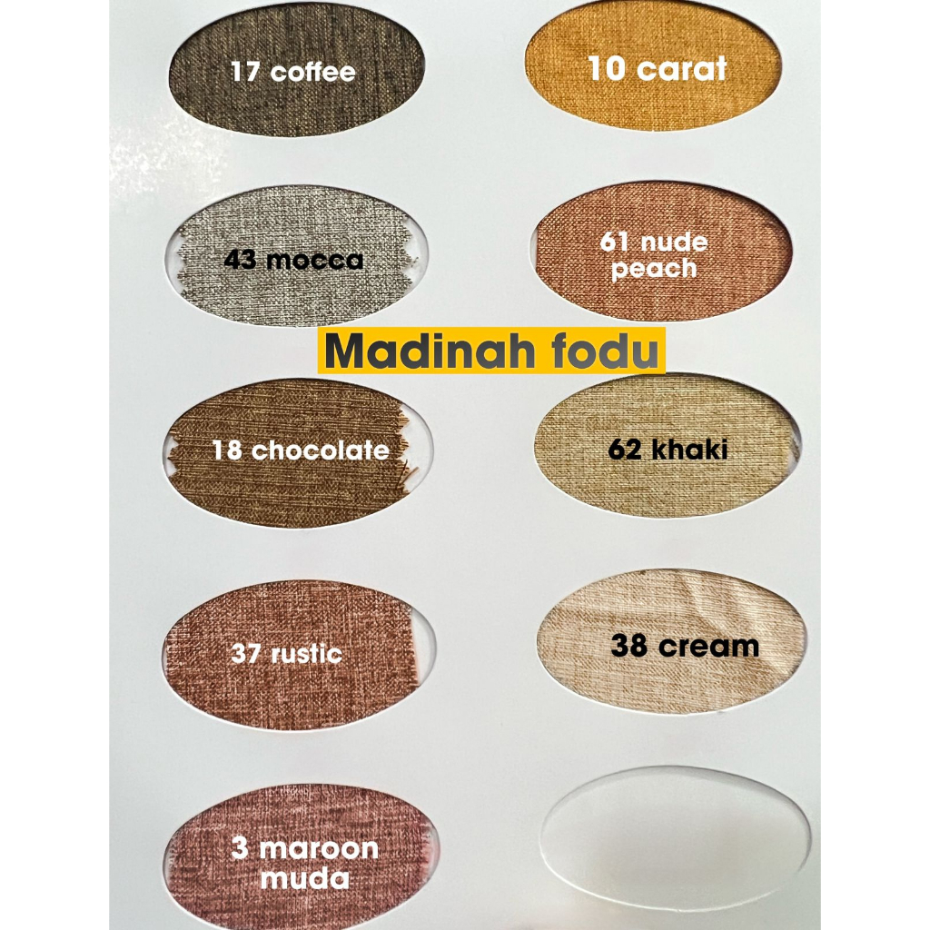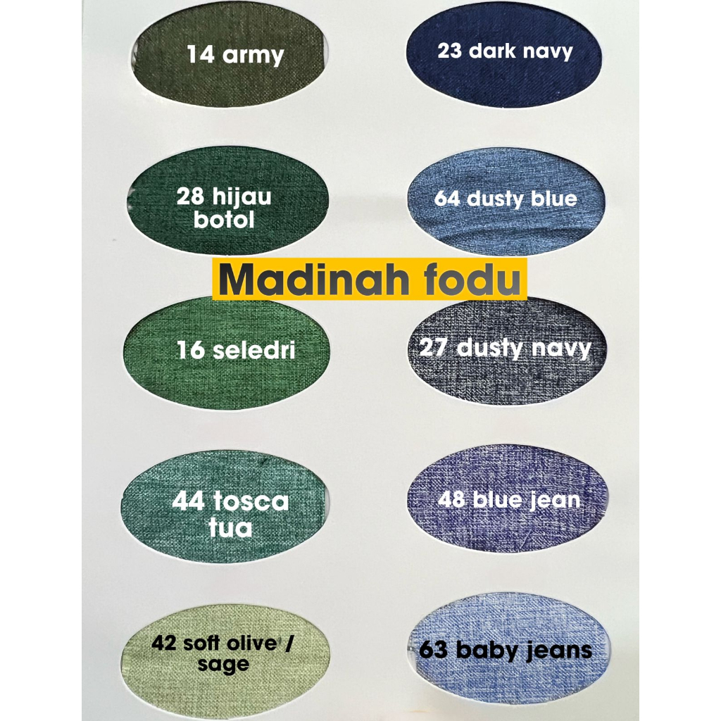 ROL 3 maroon muda, ROL 10 carat madina, ROL 11 dusty pink, ROL 16 seledri, ROL 17 coffee madina, ROL 18 chocolate, ROL 19 hitam jeans, ROL 48 blue jean, ROL 23 dark navy, ROL 27 dusty navy, ROL 28 hj botol, ROL 37 rustic, ROL 38 cream, ROL 41 baby pink, ROL 42 soft olive, ROL 44 tosca tua, ROL 47 silver, ROL 14 army, ROL 46 merah, ROL 45 mocca, ROL 43 baby blue, ROL 63 baby jean, ROL 60 dark maroon, ROL 64 dusty blue, ROL 62 khaki, ROL 61 nude peach, ROL BW, ROL Putih Bersih