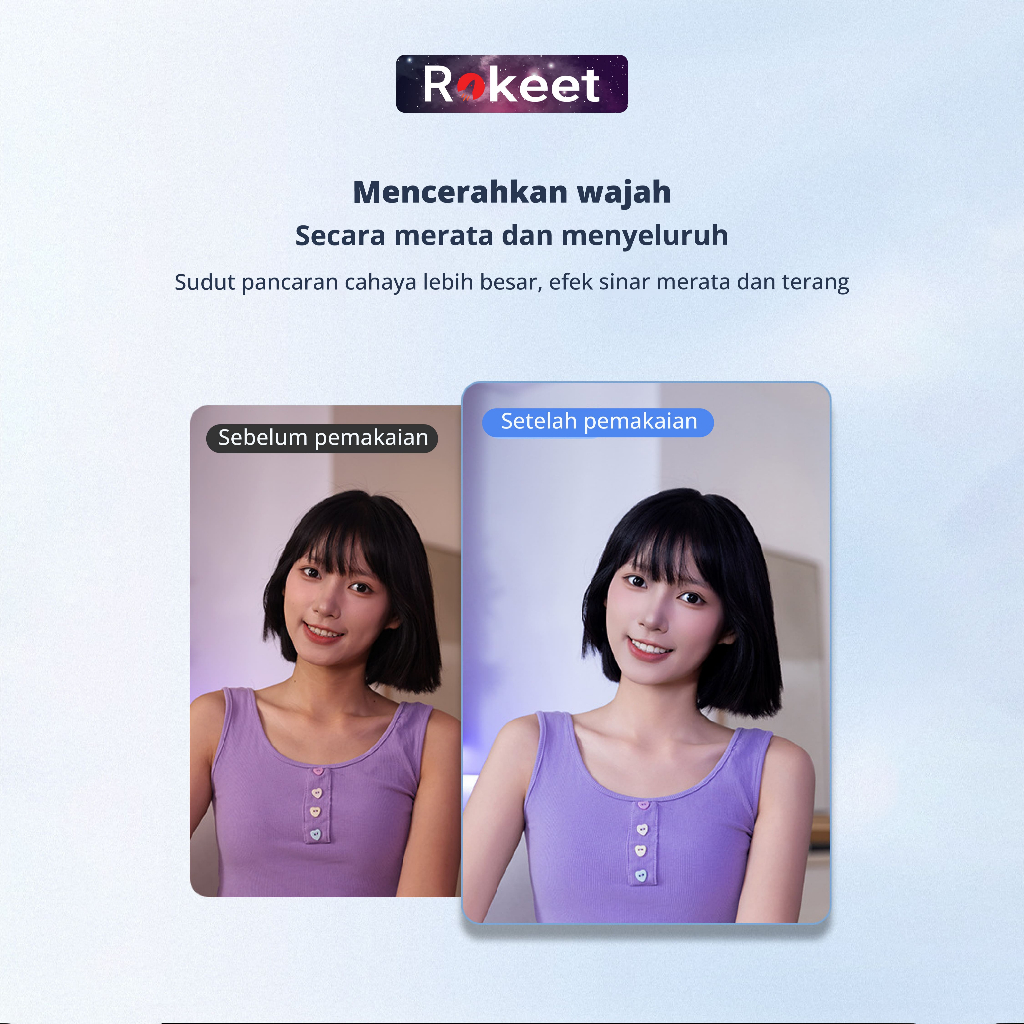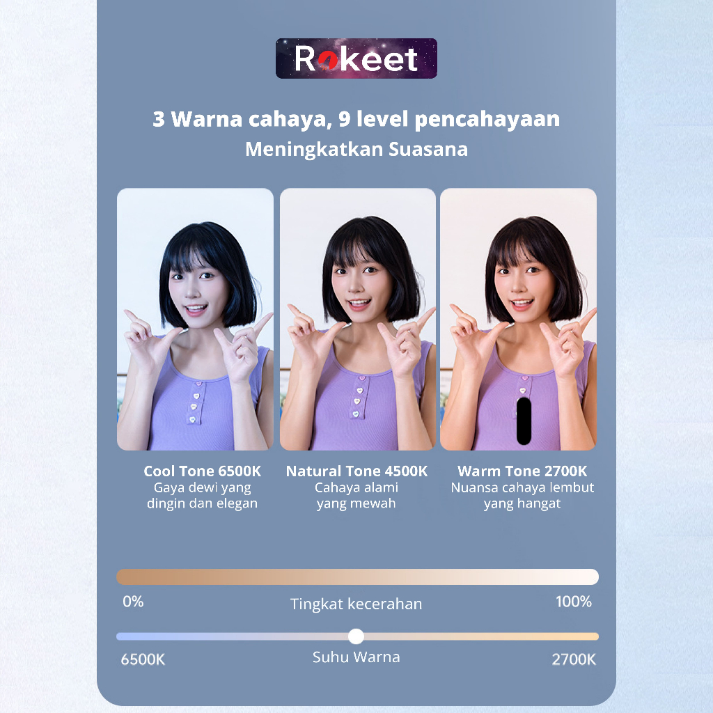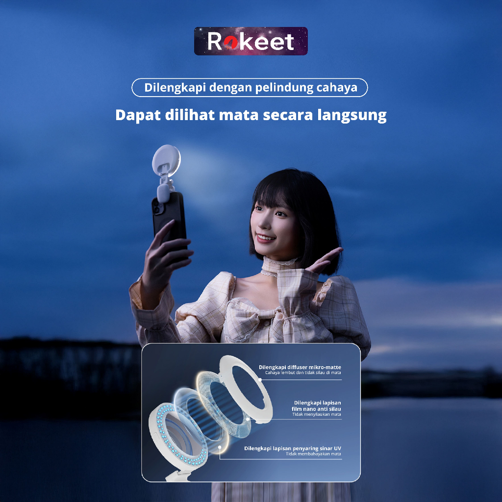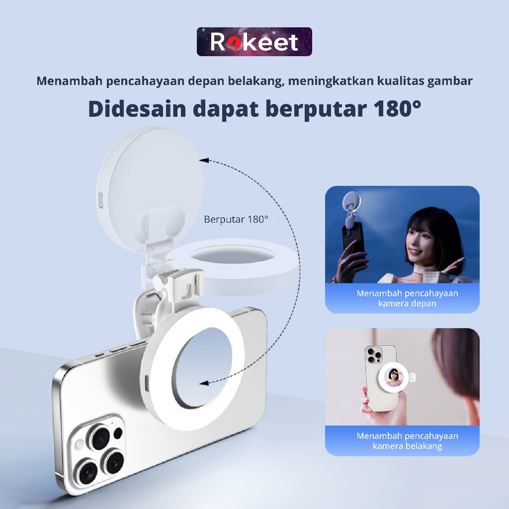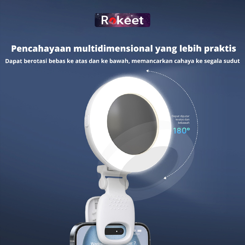 Rokeet Ring Light Mini Portable Lampu Selfie 180° Handphone Jepit Dengan Cermin & 9 Level Pencahayaan