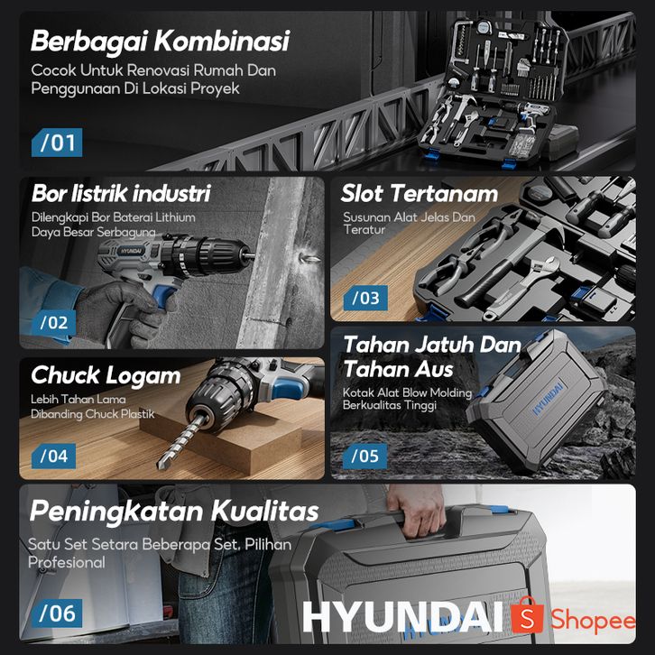 HYUNDAI Mesin Bor Listrik Set Lengkap Baterai Cordless Alat Tukang Tool Kit Tang Obeng Palu Kunci Pas Pita Pengukur