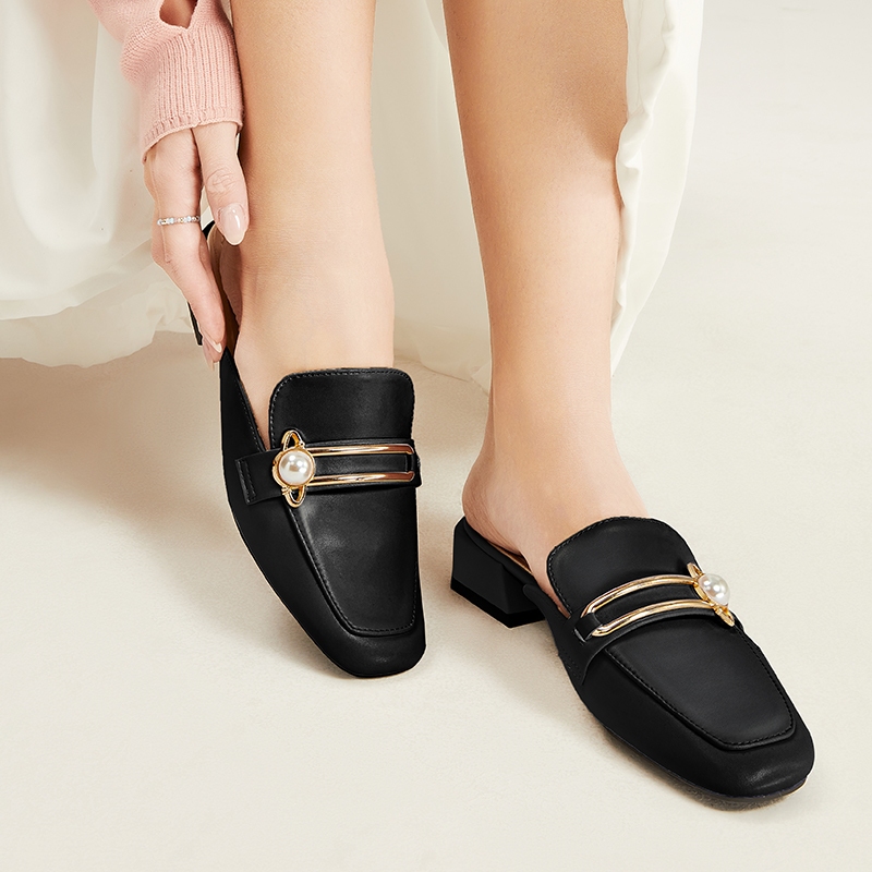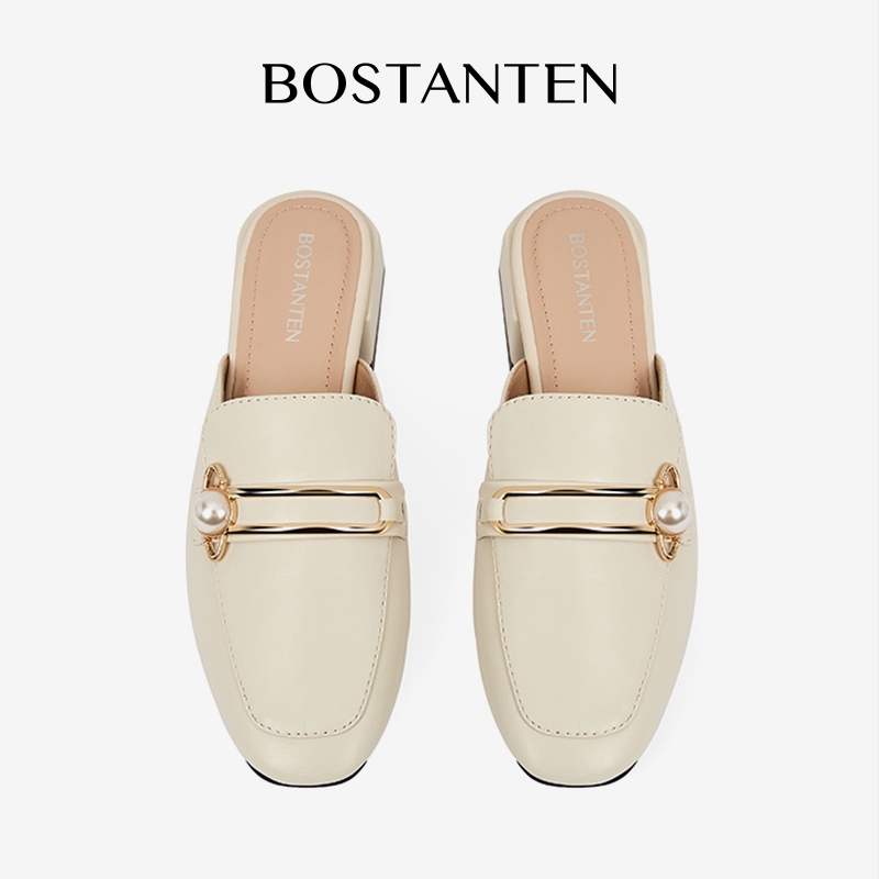 [Mall] BOSTANTEN SEPATU HAK TAHU SEPATU MULES FLATSHOES HEELS SEPATU TUNGGAL DENGAN TUMIT BERAT WANITA, KEPALA PERSEGI, SEPATU MUTIARA KECIL, SEPATU RATA