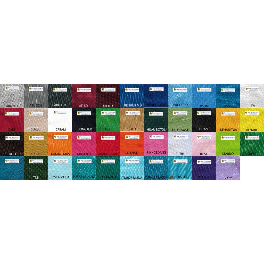 Putih, BABY, Krem, ROSE, COKLAT SUSU, ABU MUDA, ABU SEDANG, Abu Tua, TURKIS MUDA, TURKIS SEDANG, TURKIS TUA, UNGU MUDA, KENARI, KENARI TUA, PINK SEDANG, ORANGE, KUNING MAS, STABILO, TURKIS PEACOK, MAGENTA, KOPI, BSDT, BSDM, TNI, FUJI, SUPER, HIJAU BOTOL, HATI SEDANG, TOSKA SEDANG, TOSKA TUA, Ungu Tua, CABE, BENHUR, BENHUR MUDA, DONGKER, Hitam, ORANGE BATA, KUNING BUSUK, TOSKA MUDA, HATI TUA, GOLD, BW, Sage