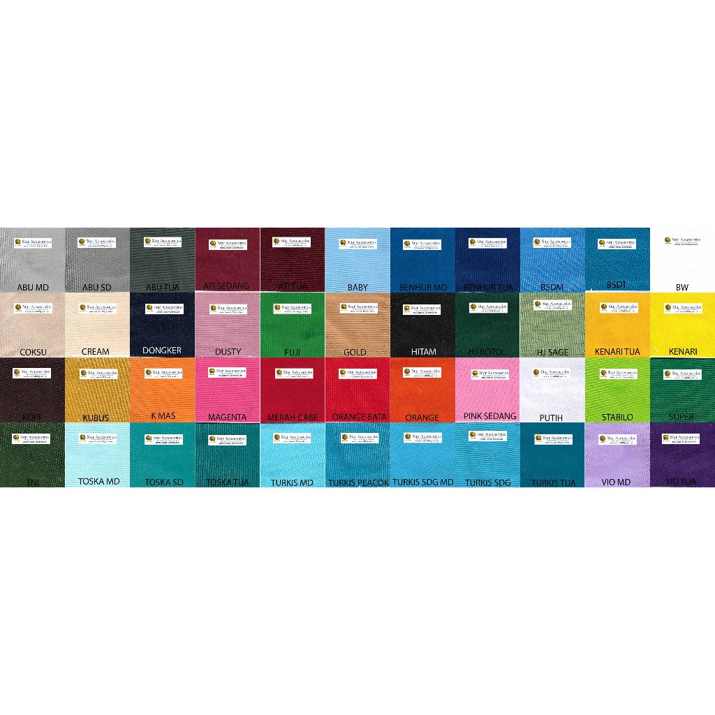 Krem, COKSU, ABU MUDA, ABU SEDANG, Abu Tua, TURKIS MUDA, TURKIS SEDANG, TURKIS TUA, VIOLET MUDA, KENARI, KENARI TUA, PINK SEDANG, ORANGE, KUNING MAS, STABILO, TURKIS PEACOK, MAGENTA, KOPI, BSDT 1836, BSDM, TNI, FUJI, SUPER 1879, HIJAU BOTOL, TOSKA SEDANG, TOSKA TUA, VIOLET TUA, CABE, BENHUR, BENHUR MUDA, DONGKER, Hitam, ORANGE BATA, KUBUS, DUSTY, TOSKA MUDA, HATI TUA, TURKIS SEDANG MUDA, GOLD, BW, Sage, PUTIH