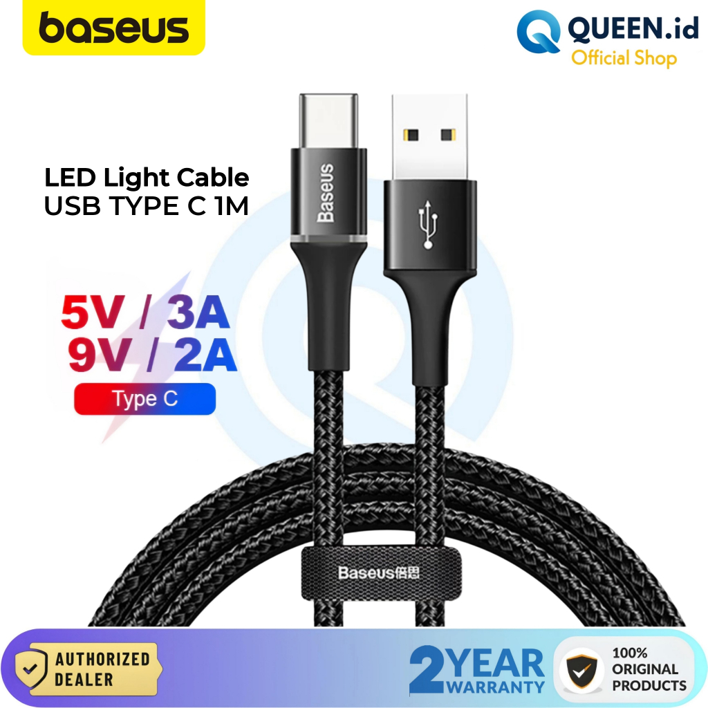 Baseus Halo LED Kabel Data Charger USB TYPE C 3A 1M 100cm QC 3.0 Fast Charging Braided Nylon