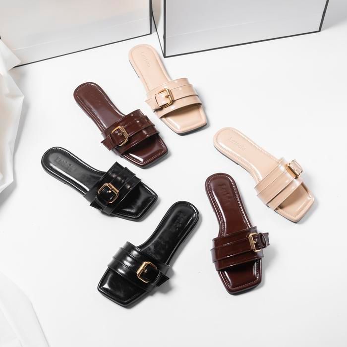 LEONY - Vero sandal flat wanita | sendal basic teplek perempuan Hitam - Brown 36